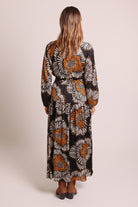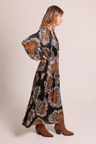 The Holding On Blame Dress in black features a tiered hem maxi silhouette with a loose-fitting top for effortless elegance. Designed with side pockets and a voluminous skirt, it combines comfort with refined style. Long billow sleeves with elasticated cuffs add a graceful touch, while the unlined fabric ensures a lightweight feel. Perfect for sophisticated occasions, this dress offers both movement and poise.