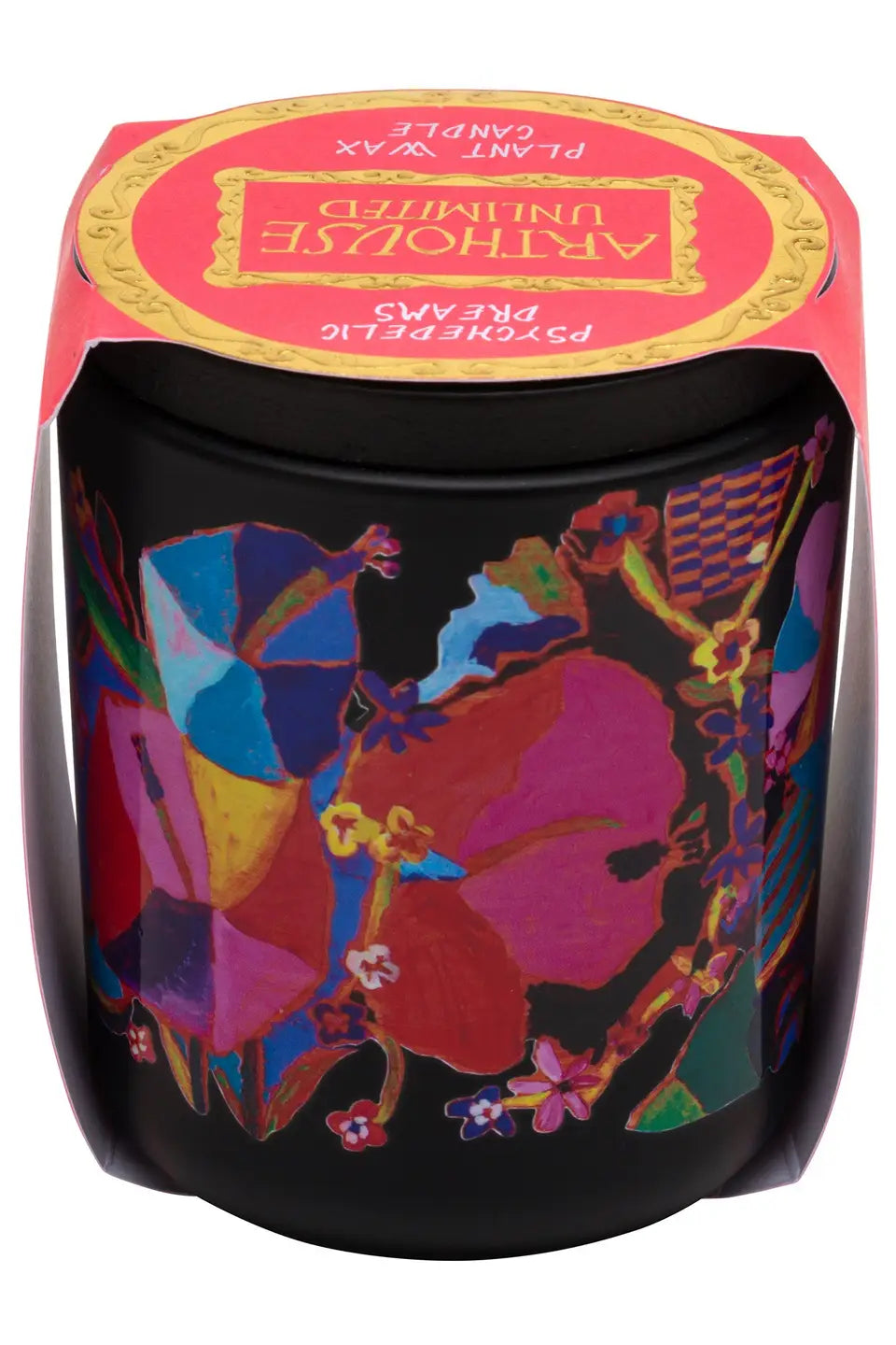 A uniquely fragranced vegan-friendly candle featuring the beautiful ‘Psychedelic Dreams’ artwork created by talented ARTHOUSE Unlimited artist Laura Tregellas. The candle aroma evokes notes of Violet, Pink Pepper, and Orange Blossom. Made in the UK, this candle has 40 hours of burn time & the plant wax is hand poured into a re-useable highly decorative vessel. A timeless gift for art lovers, joy givers & good-cause supporters everywhere!
