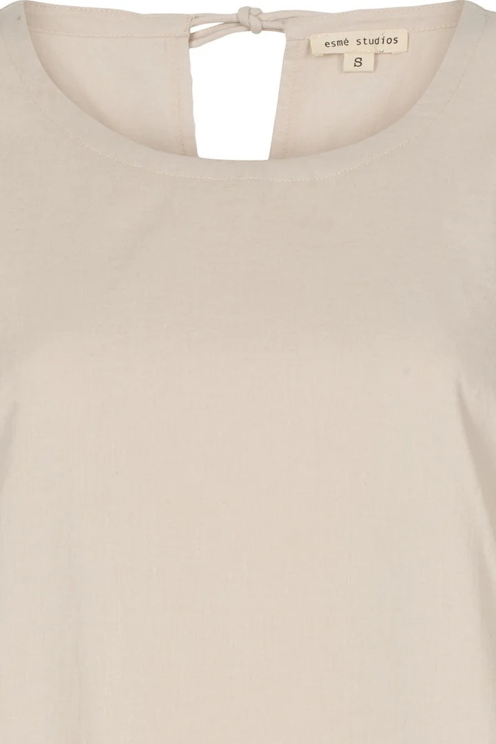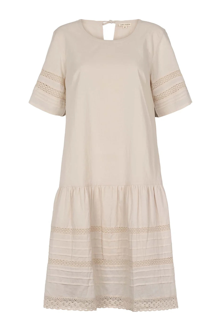 Elevate your style with the luxurious Amina Dress in Oatmeal. Crafted from 100% GOTS certified organic cotton, this dress features delicate short sleeves with pintucks and lace details. The back boasts a slit and tie detail for a feminine touch. Available in Size S with a full length of 105cm.