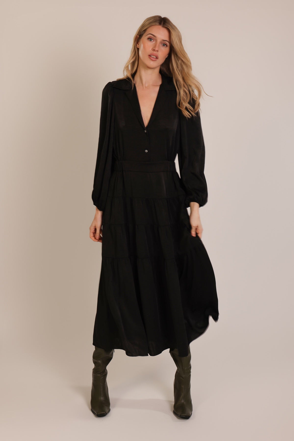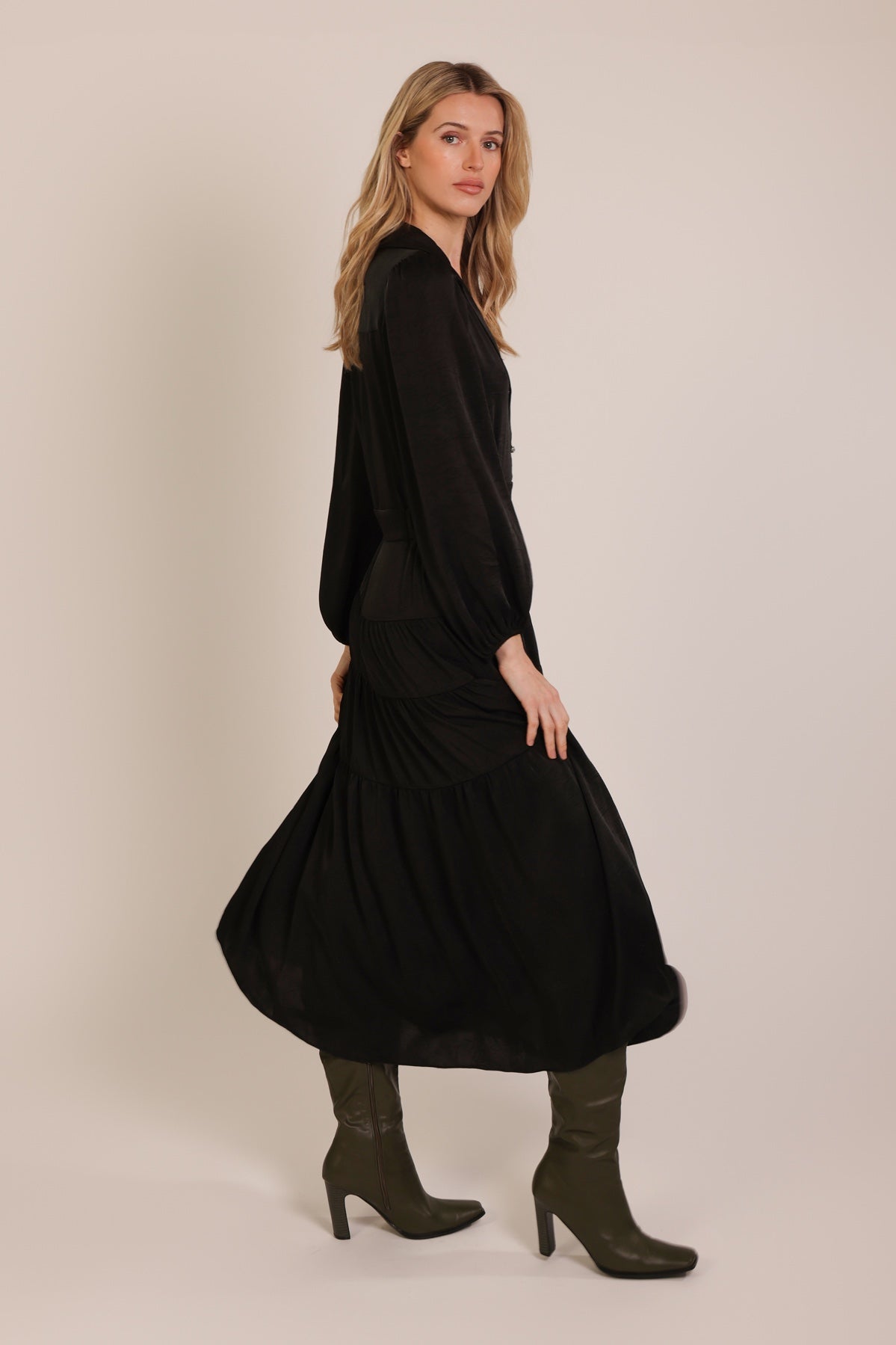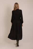 The Rigby Dress by Story of Silence combines elegance and comfort with its midi length and sophisticated shirt collar featuring a subtle V-neck. Designed with a belted waist and smocked back for a flattering fit, it showcases delicate diamante buttons and long sleeves with elasticated cuffs. Practical pockets and a tiered skirt add both style and functionality. Crafted from a soft blend of 80% viscose and 20% polyester, this dress offers a refined silhouette perfect for any occasion.
