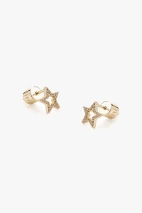 Indulge in luxury with our Pave Star Earrings in Gold. These stunning open star studs feature a delicate Pave Cubic Zirconia stone for a touch of glamour. Crafted from recycled brass and plated with 925 sterling silver or gold, finished with an anti-tarnish and water resistant coating. Hypoallergenic and presented in a recycled fabric pouch. Height: 8mm.