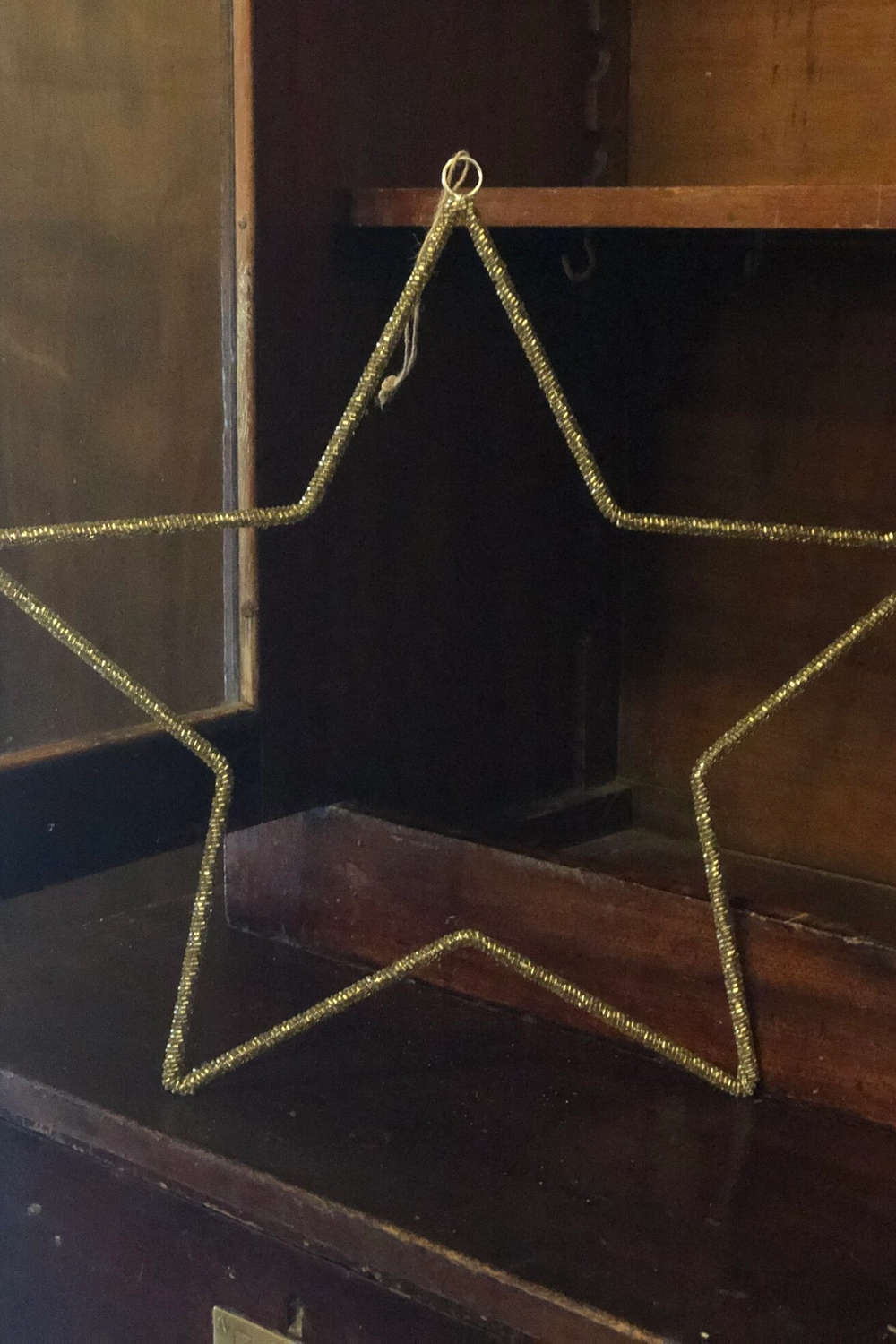 This stunning Antique Gold Beaded Star Decoration is a must-have for any luxurious home. Handcrafted with intricate glass beads, it can be displayed on a wall or in a window for a captivating effect. Imported from India, this 38 cm wide star is sure to catch the eye and enhance any space.