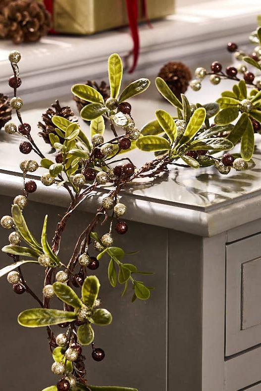 Add some light and sparkle to your indoor Christmas decorations with our copper mistletoe LED Christmas garland. Featuring glittering gold and copper berries which reflect the light from the LED lights beautifully, this artificial Christmas garland is an ideal decoration for displaying on your mantelpiece, windowsill, or around your banister during the Winter months.