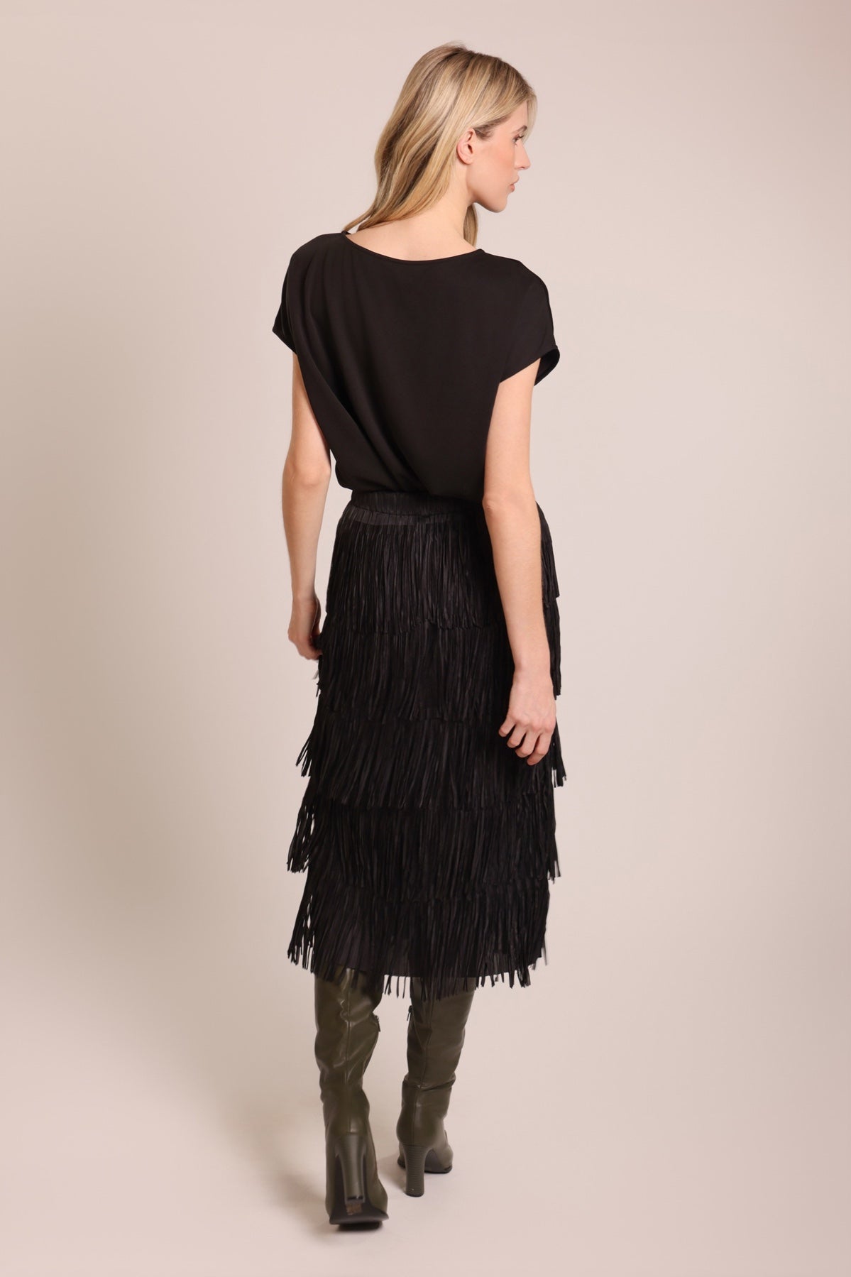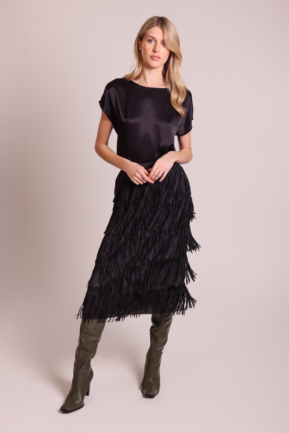 The Gloria Skirt by Nobody Asked features a tiered fringed design that adds elegant movement to your look. Crafted with a comfortable stretch waistband and a flattering midi length, it combines style with ease. Made from a soft blend of 77% viscose and 23% nylon, this skirt offers a refined silhouette perfect for sophisticated occasions.