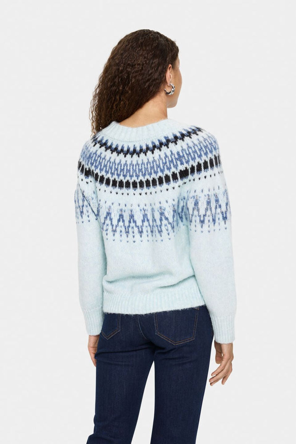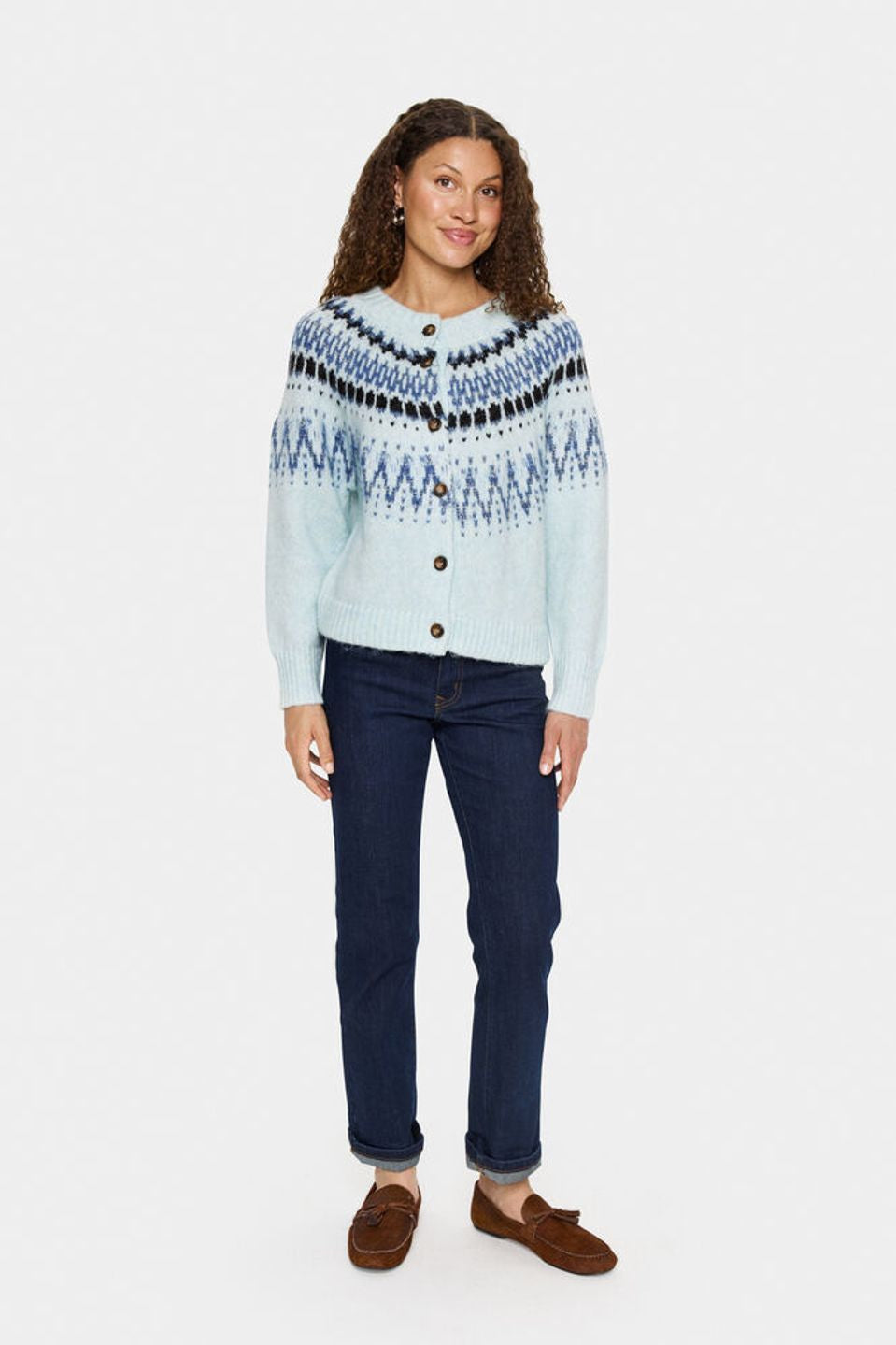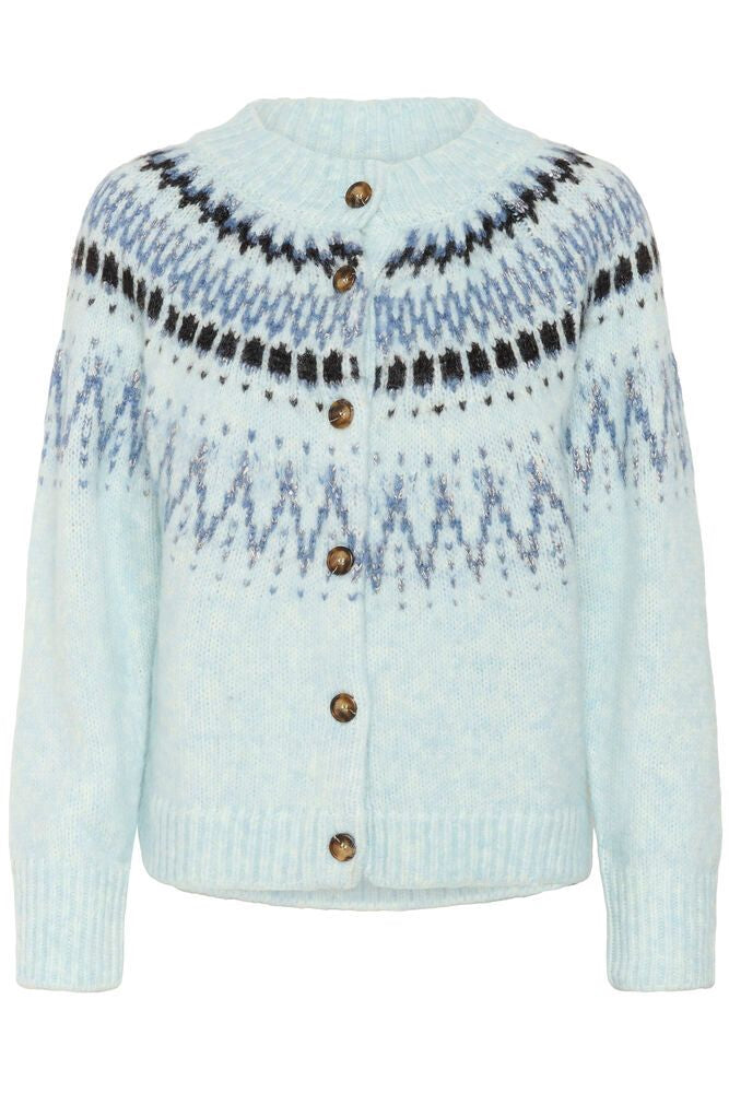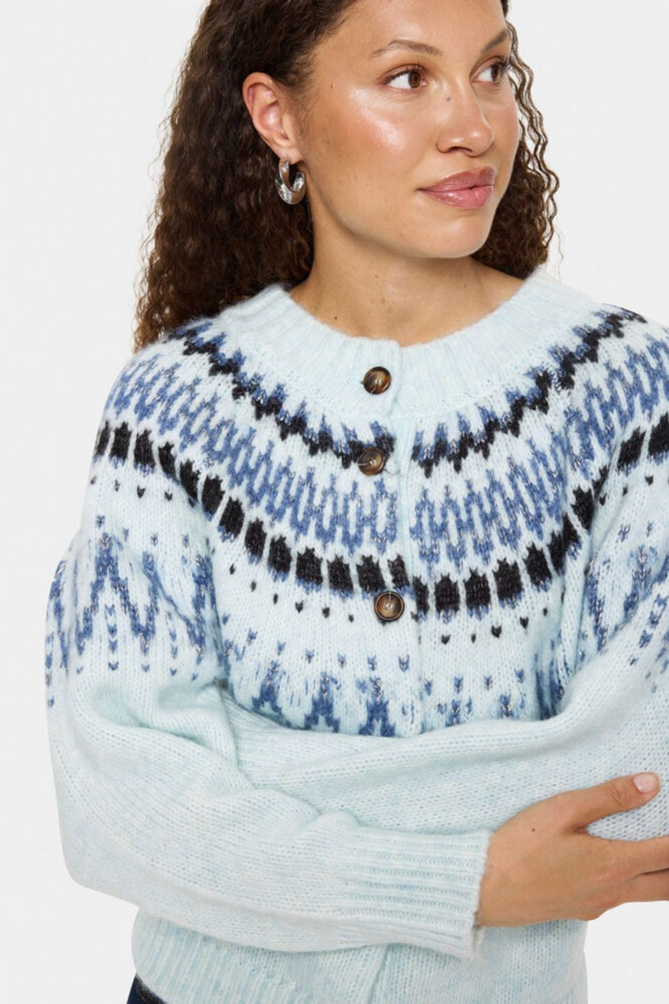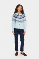 Add a splash of fun to your wardrobe with the Megna Cardigan in Starlight Blue Melange. Featuring a playful geometric pattern in two shades of blue, this cozy layer brings a fresh, modern twist to your everyday look. Perfect for brightening chilly days with a touch of lively style and comfortable warmth.