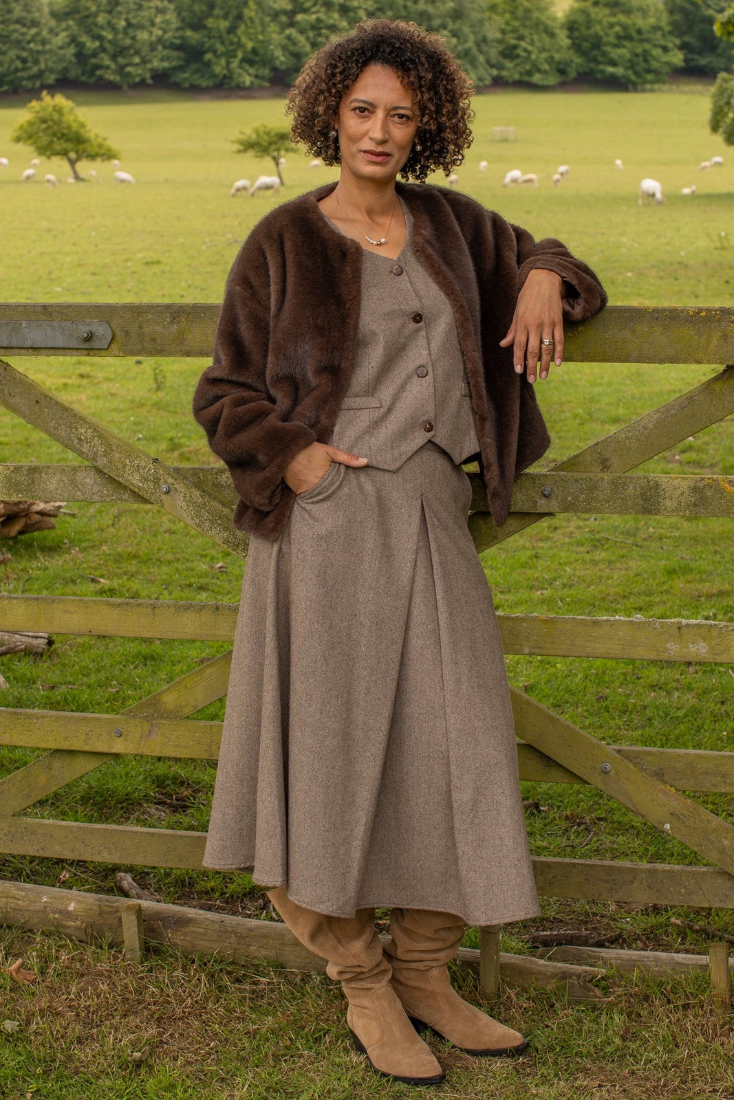 Delilah is a luxuriously soft faux fur jacket designed in a flattering boxy silhouette that sits just at the waist. It features a clean round neckline, discreet hook-and-eye fastening, and side pockets for added ease. Perfect for layering, Delilah adds warmth, texture, and a touch of glamour.