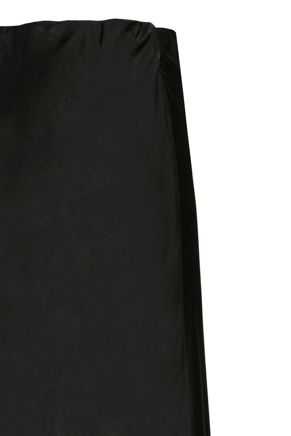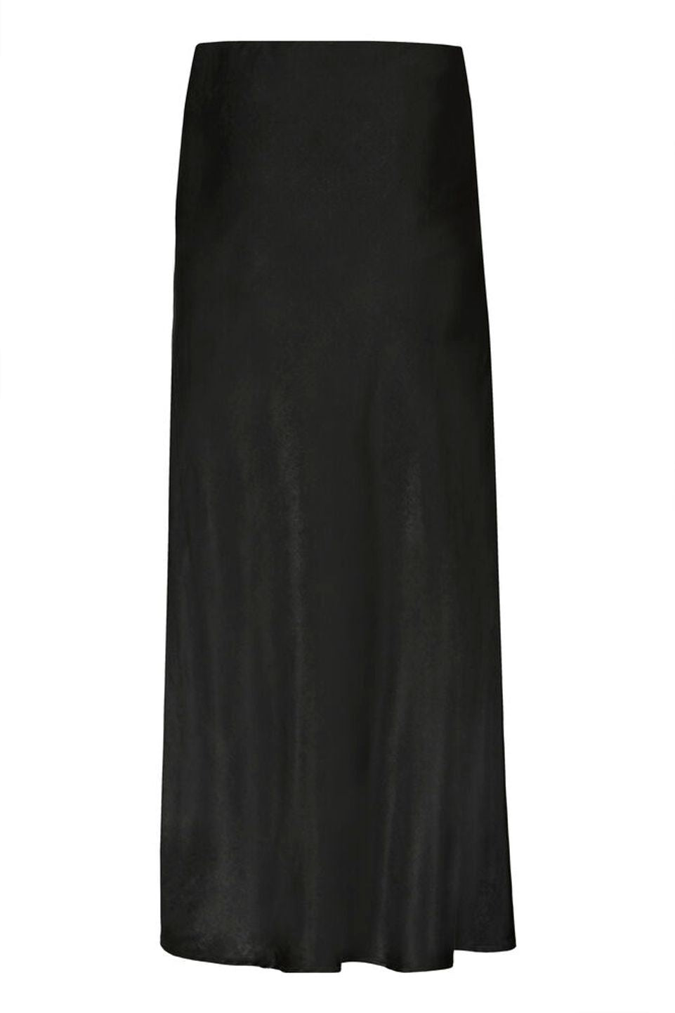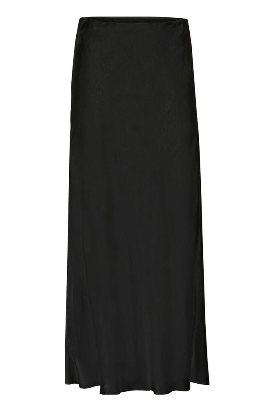 Loren Skirt in black satin. Featuring a smooth, lustrous finish and a comfortable elastic waistband, this skirt combines elegance with effortless wearability. Its sleek silhouette makes it perfect for both refined daytime looks and chic evening ensembles.