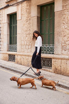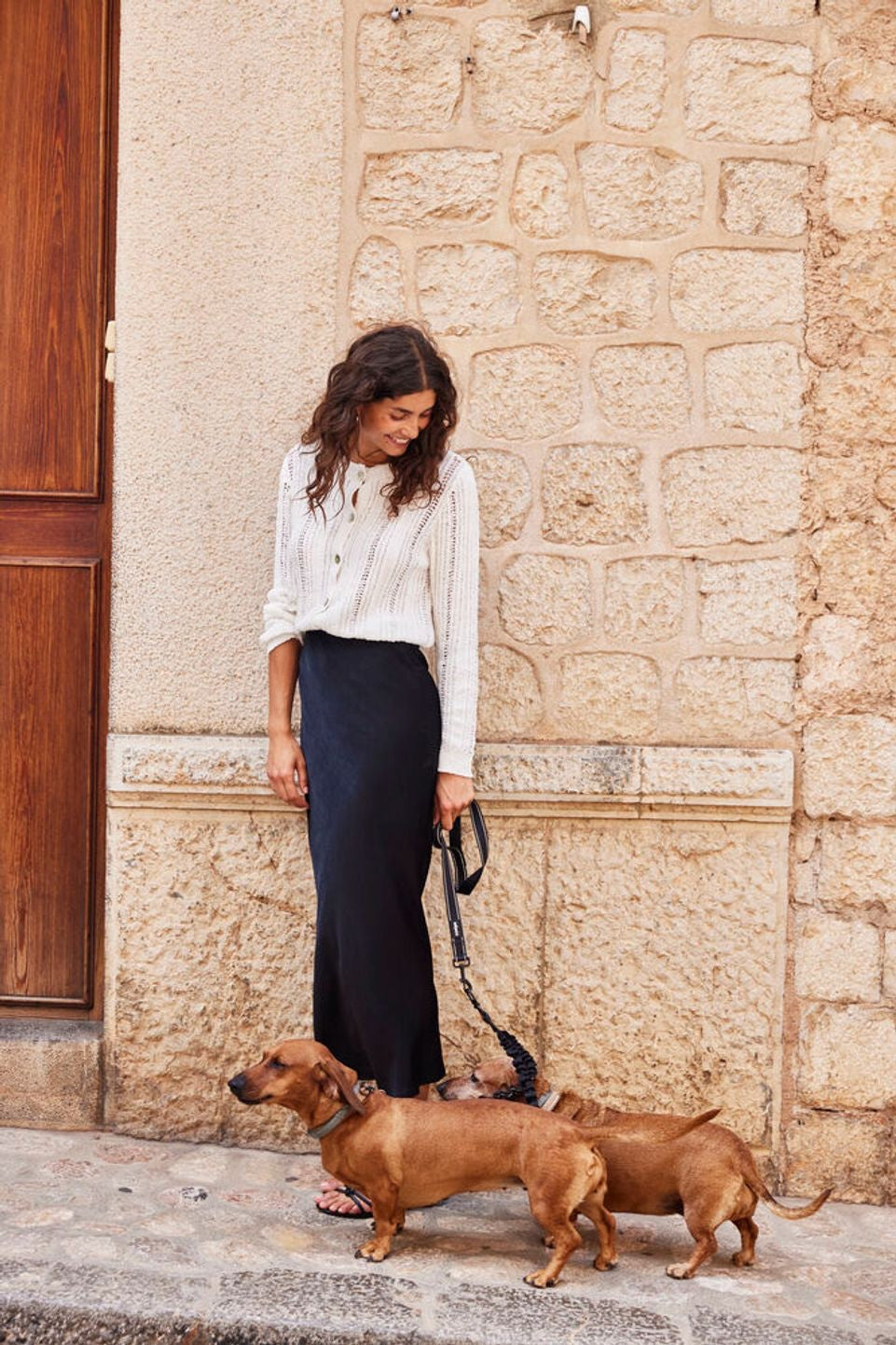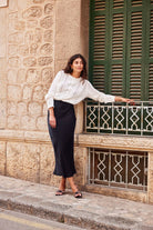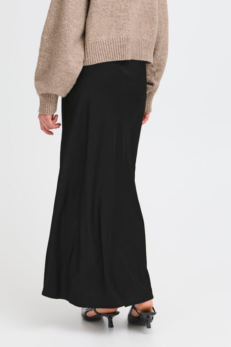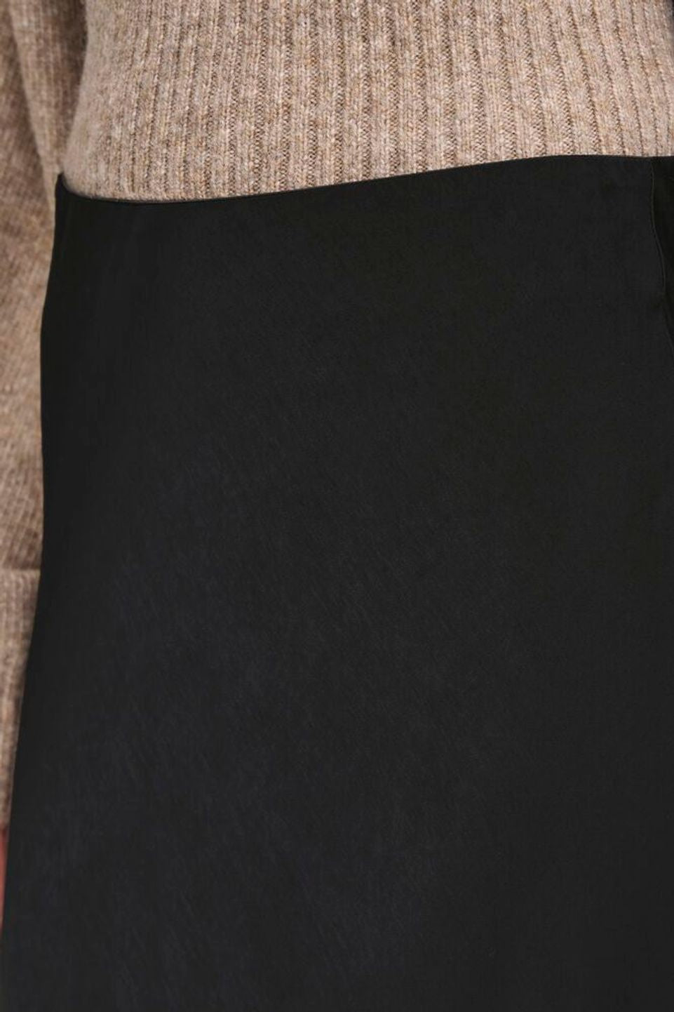Loren Skirt in black satin. Featuring a smooth, lustrous finish and a comfortable elastic waistband, this skirt combines elegance with effortless wearability. Its sleek silhouette makes it perfect for both refined daytime looks and chic evening ensembles.