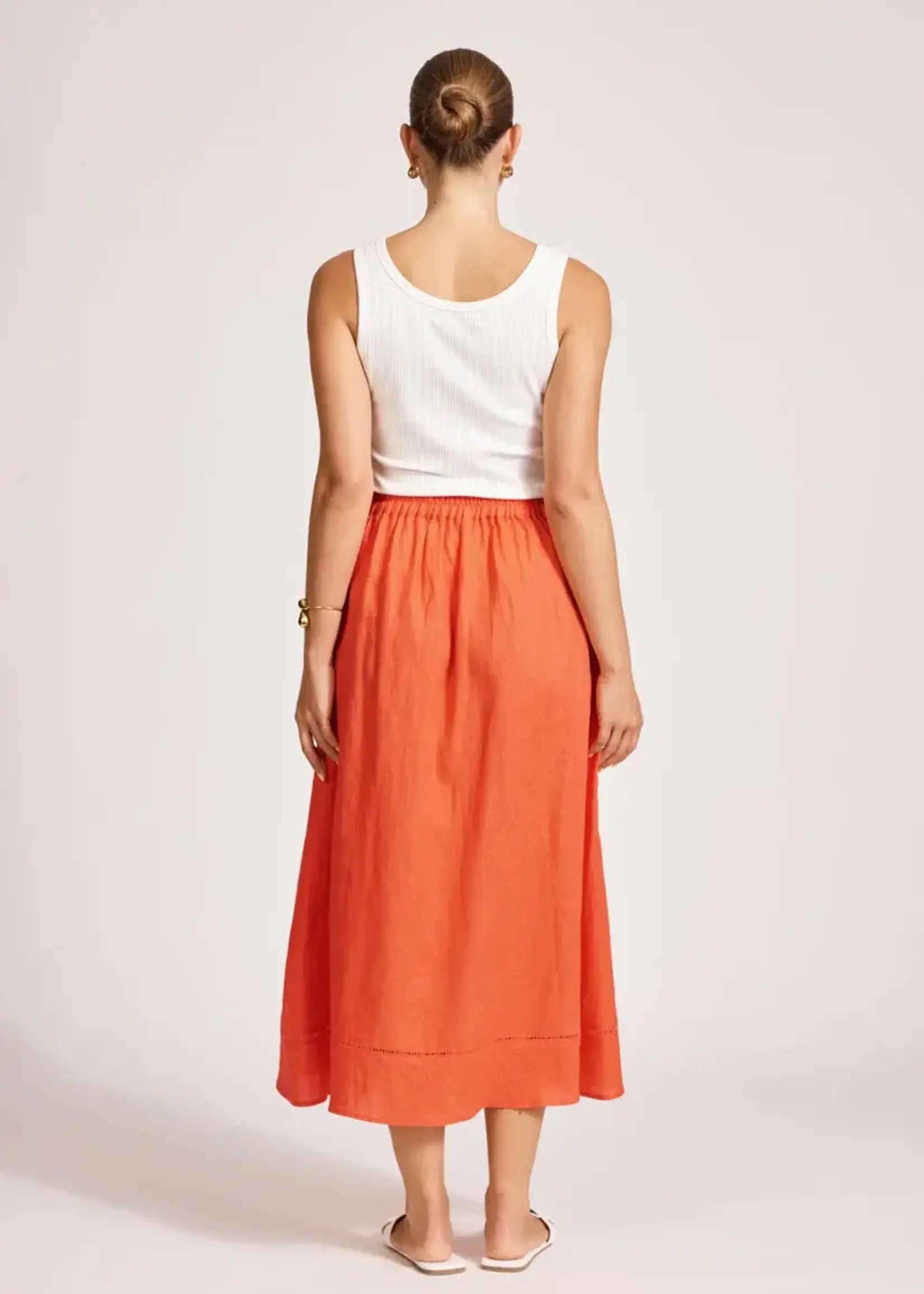 A timeless maxi skirt designed to flatter. Crafted from 100% linen with a flat front waistband and elasticated back for comfort. Features functional pockets, ladder lace trim above the hem, and an A-line silhouette.