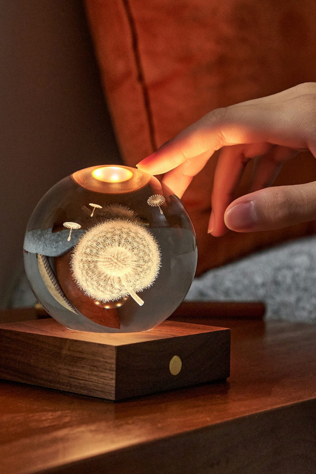 With a height of 12cm, the crystal ball pieces sit on natural walnut wood base to complement your interior design. You can switch between three light intensity levels by touching the copper button on the front of the solid natural wood base. The crystal is also polished to a shine that reflects light and creates a stunning effect in any room. The walnut base is fitted with a rechargeable battery that can keep your space illuminated with stunning light for up to 16 hours. The USB-C port in the back makes for easy charging.