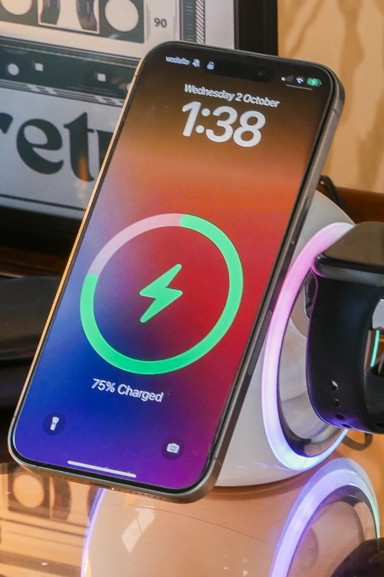 The Capsule 3-in-1 Wireless Charger features a unique sequence of lighting options: warm light, cold light, sleep light, and rainbow light. Simply touch the control ring and hold for 2 seconds to switch on or off, allowing you to customize your ambiance with ease. For the best lighting and charging performance, we recommend using a power supply of 20W or above.