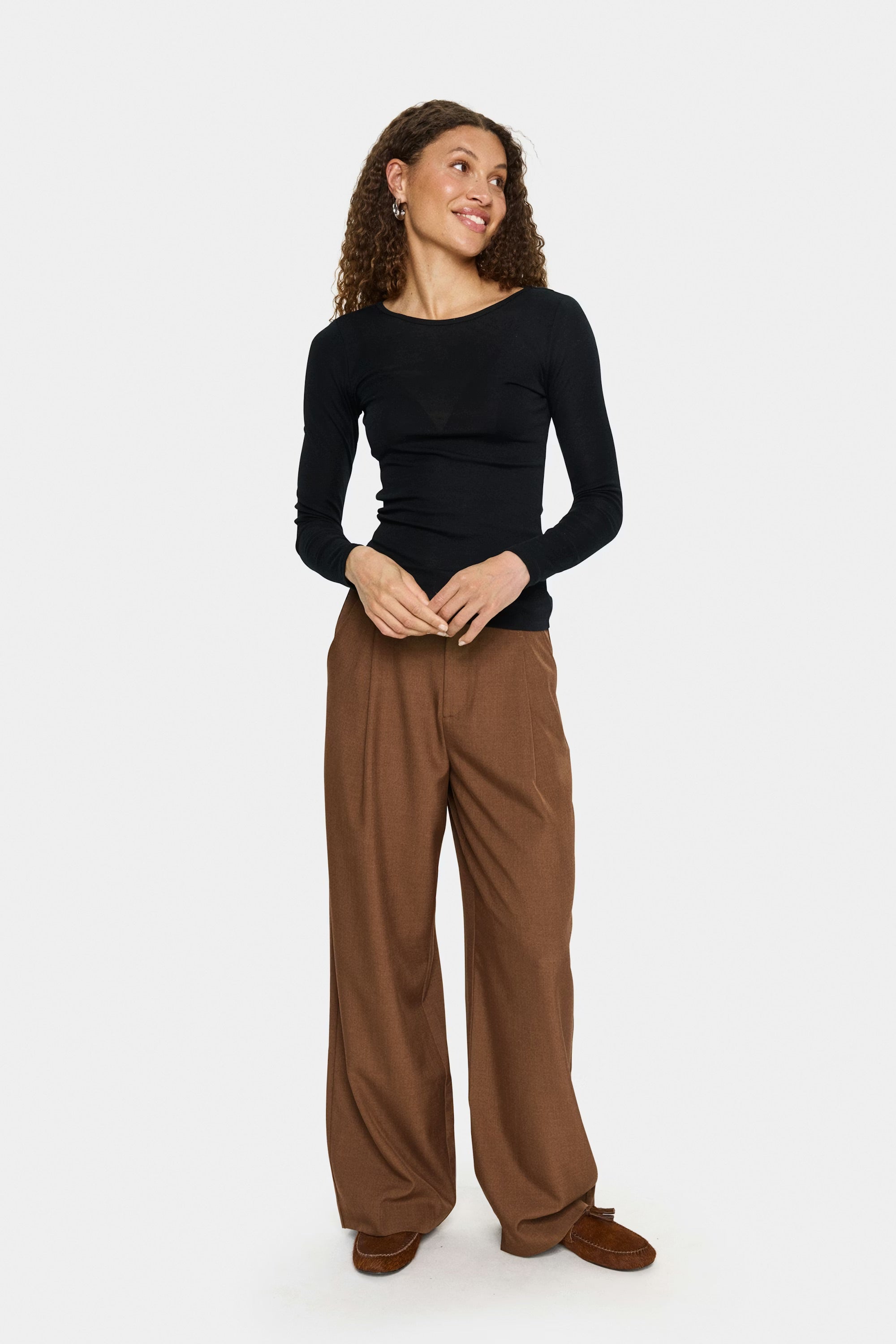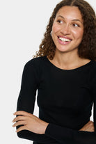 This long-sleeved, black top contains wool and features a simple, classic design with a round neckline and a form-fitting cut. The top is a perfect and versatile base layer in your wardrobe.