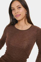 This long-sleeved, black top contains wool and features a simple, classic design with a round neckline and a form-fitting cut. The top is a perfect and versatile base layer in your wardrobe.