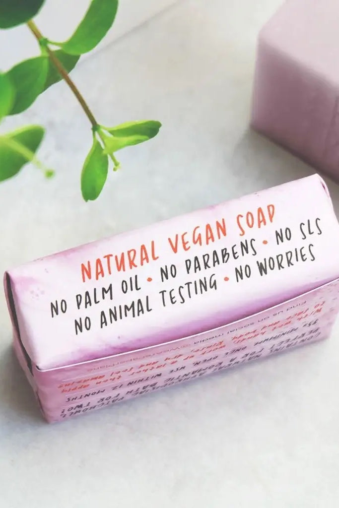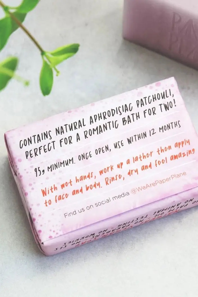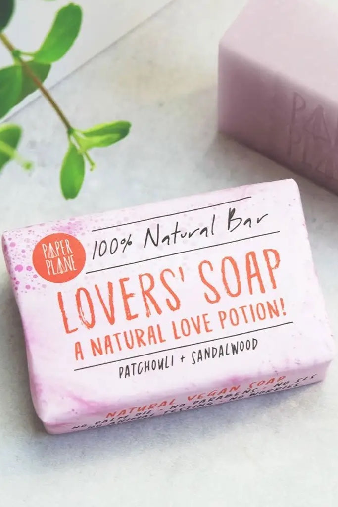 An aphrodisiacal bar of 100% natural vegan soap - perfect for sharing. Our lovers' soap makes a great gift. This handmade soap contains patchouli - famed as a libido-enhancer and sandalwood, renowned for maintaining skin health. 100% plastic-free packaging.
