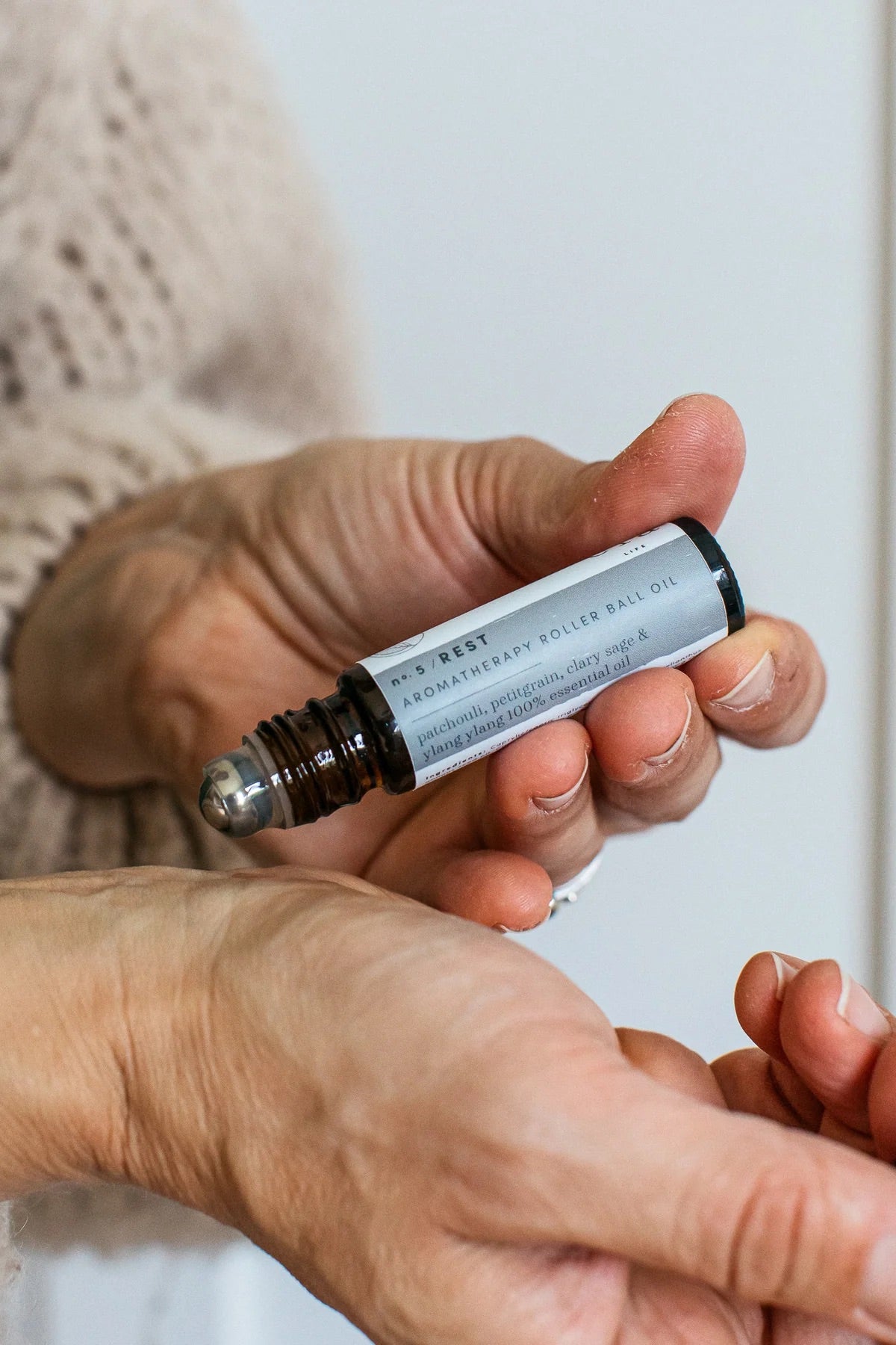 Experience the ultimate self-care ritual with our Rest No 5 Aromatherapy Roller Ball Oil. Our aromatherapy blend, Rest No 5 is a blend of Petitgrain, Patchouli, Clary Sage and Ylang Ylang 100% Essential Oils. This calming and balancing blend of essential oils are perfect to calm your body and mind and help you relax.