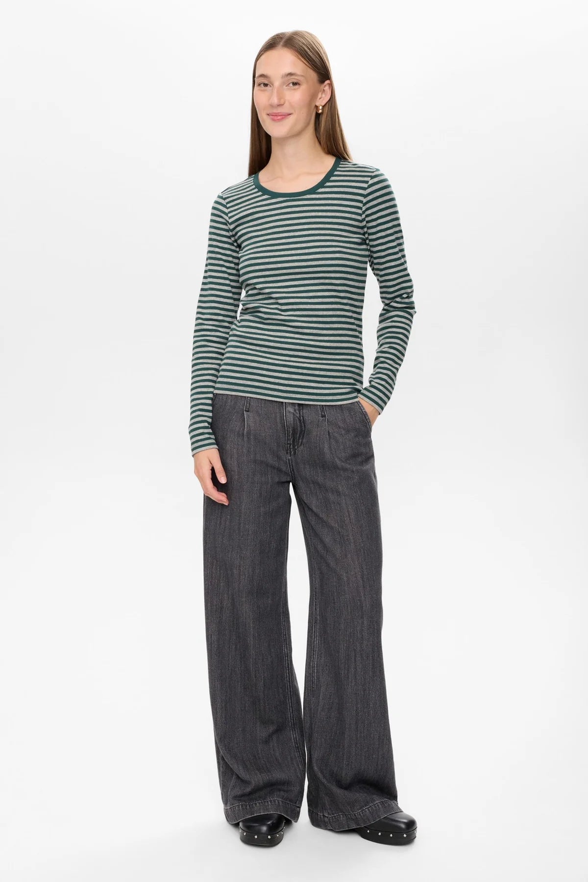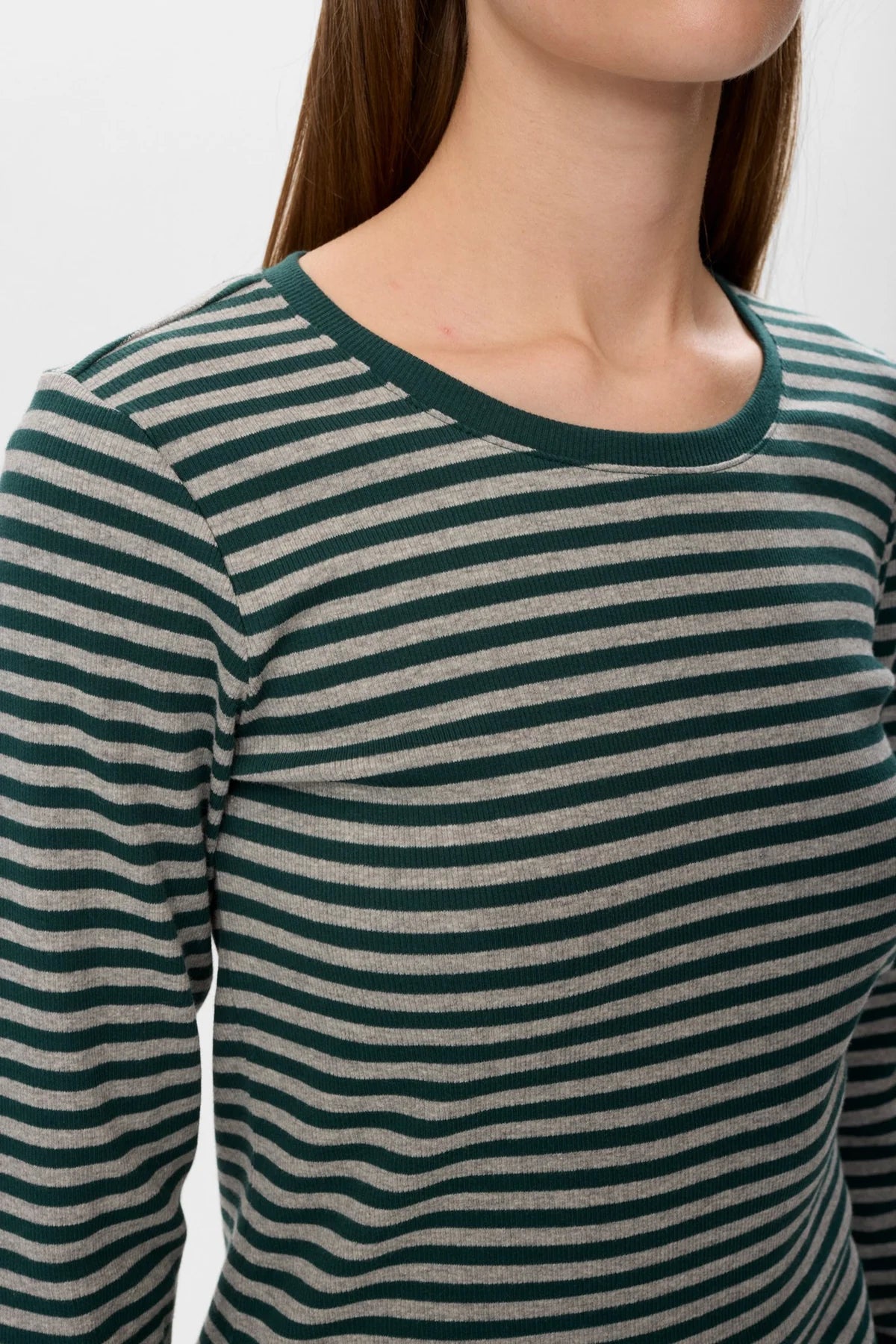 Stay cozy and stylish with the Melany Long Sleeve Stripe Top in a gorgeous green and grey stripe. Perfect as a base layer on chilly days, its timeless stripes add a fun twist to any outfit. Whether layered or worn solo, it’s your new go-to for comfort and flair this season!