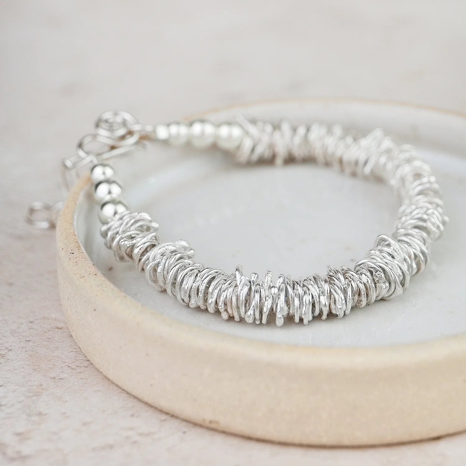 Each recycled sterling silver nugget is organically made by hand. This stunning bracelet comes with sterling silver beads. Every sterling silver large nugget bracelet is finished off with a handmade fancy sterling silver clasp.