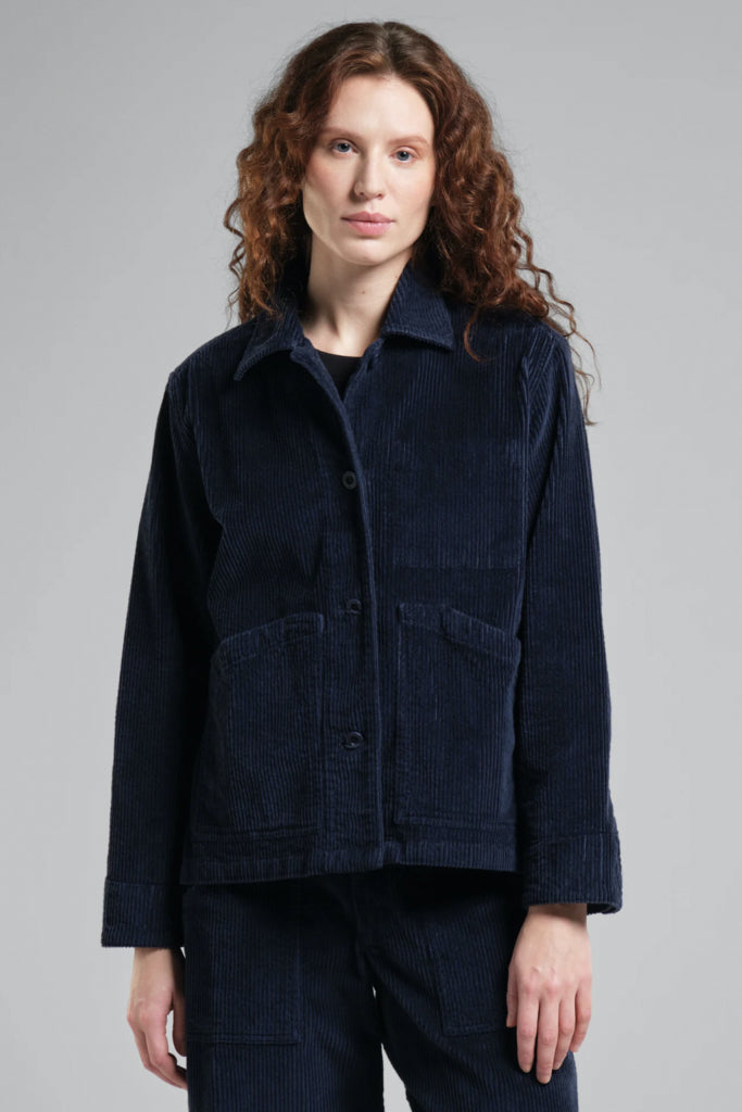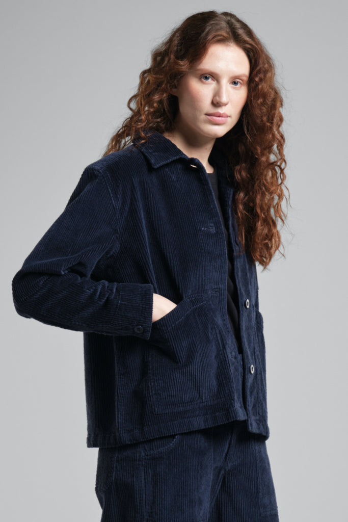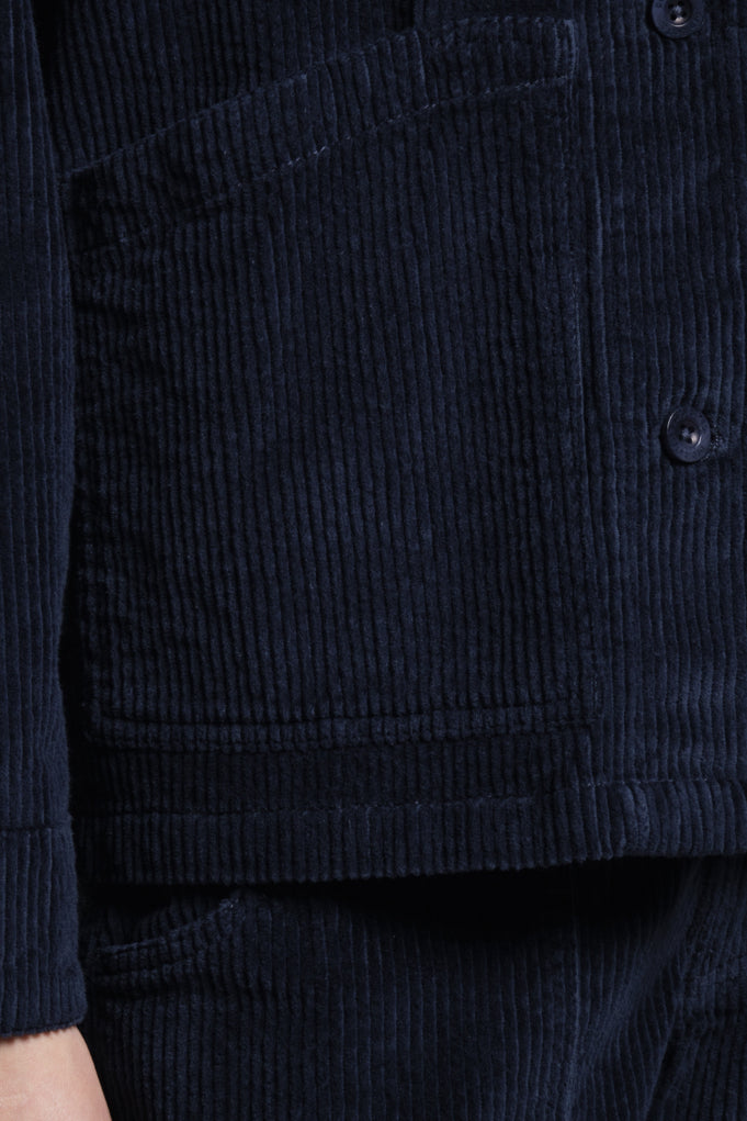 Long-sleeved shirt jacket with a relaxed fit. Angled front patched pockets and inside chest pocket with visible stitching on the outside. Button up closing and button on cuffs. Made in organic cotton corduroy.