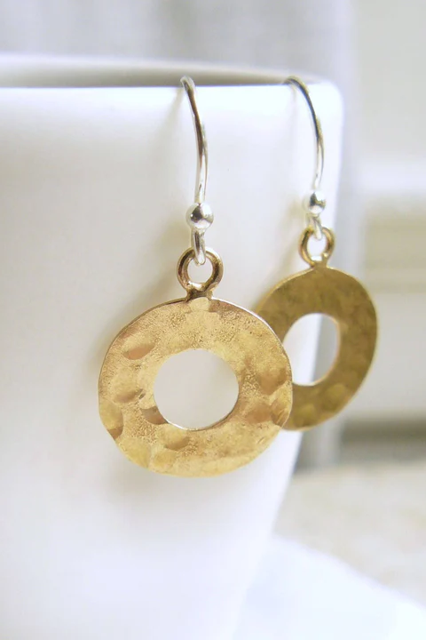 A stylish pair of hammered circle earrings made from gold vermeil, which is sterling silver plated in 18ct gold. These earrings make a wonderful gift - they are big enough to catch the light with their hammered surface, yet light enough not to drag the ears down. Do not use metal cleaners on vermeil as you will remove the plate.