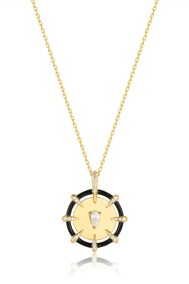 Make a statement with this bold yet elegant pendant necklace, finished with sleek, punk-inspired black detailing. Set on a 14kt gold-plated sterling silver chain, the chic gold disc pendant is finished with a single sparkling cubic zirconia stone and encircled with sparkling point details and cool black edging.