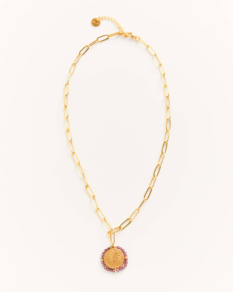 The Palma Sunset Choker is a medal surrounded by semi-precious Garnet stone, delicately assembled on a chain link. The medal is engraved on each side with a palm tree and a sun. The Sun Against Your Skin! A bright touch for all your outfits