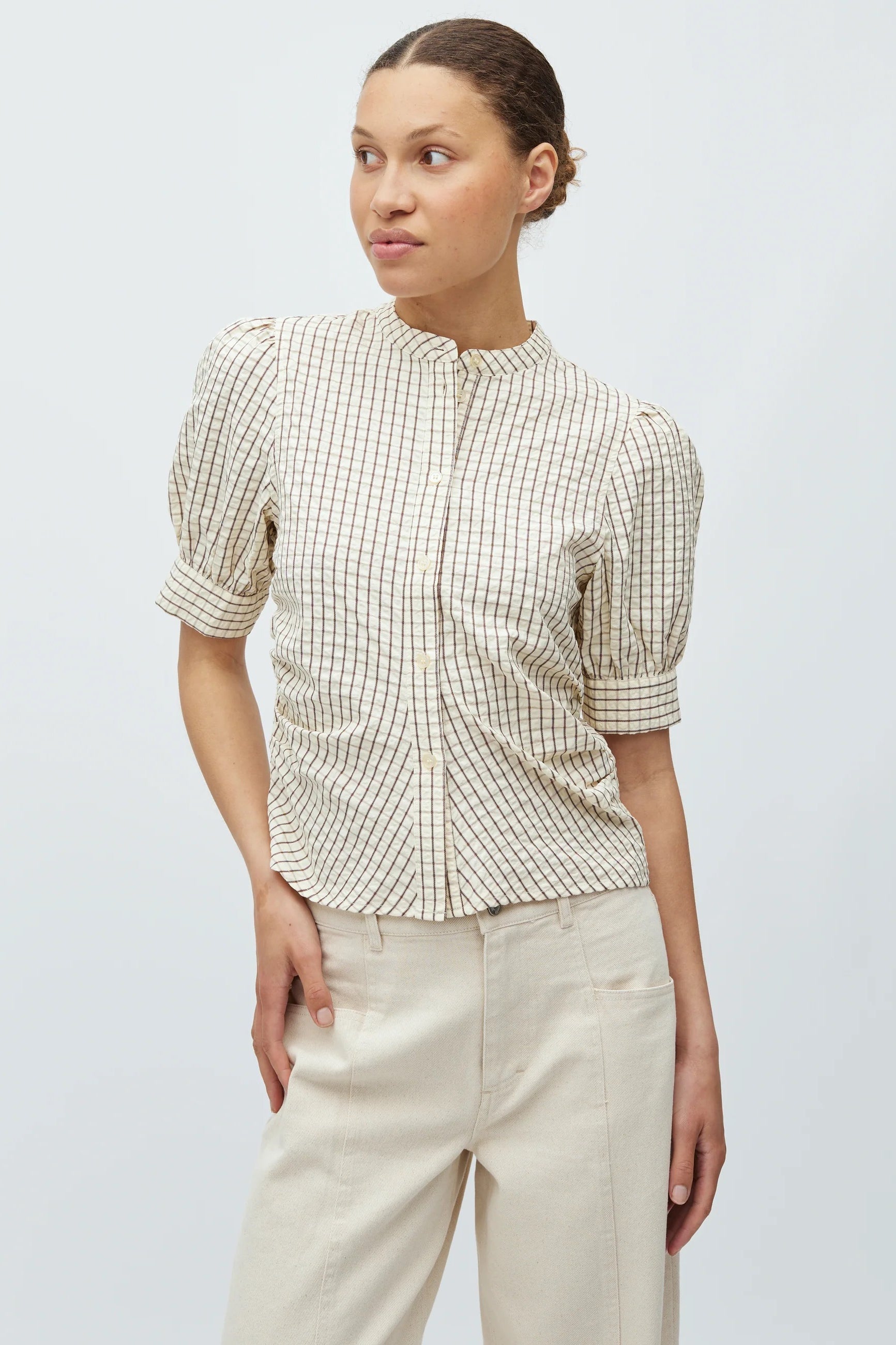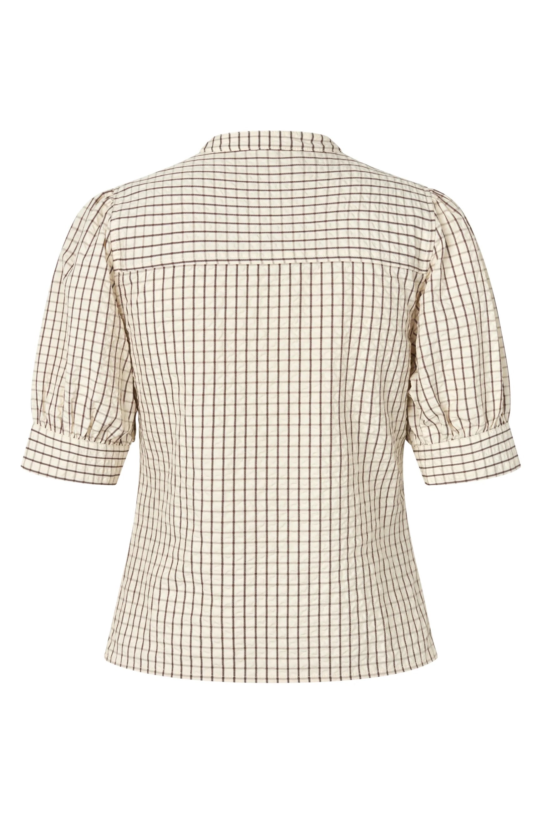 Love this blouse , it’s a little bit different and has a light beige background with a subtle soft black check pattern . The sleeves are slightly puffed and the waist is softly gathered at the side to give a fitted shape.