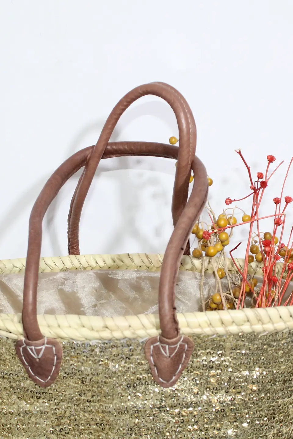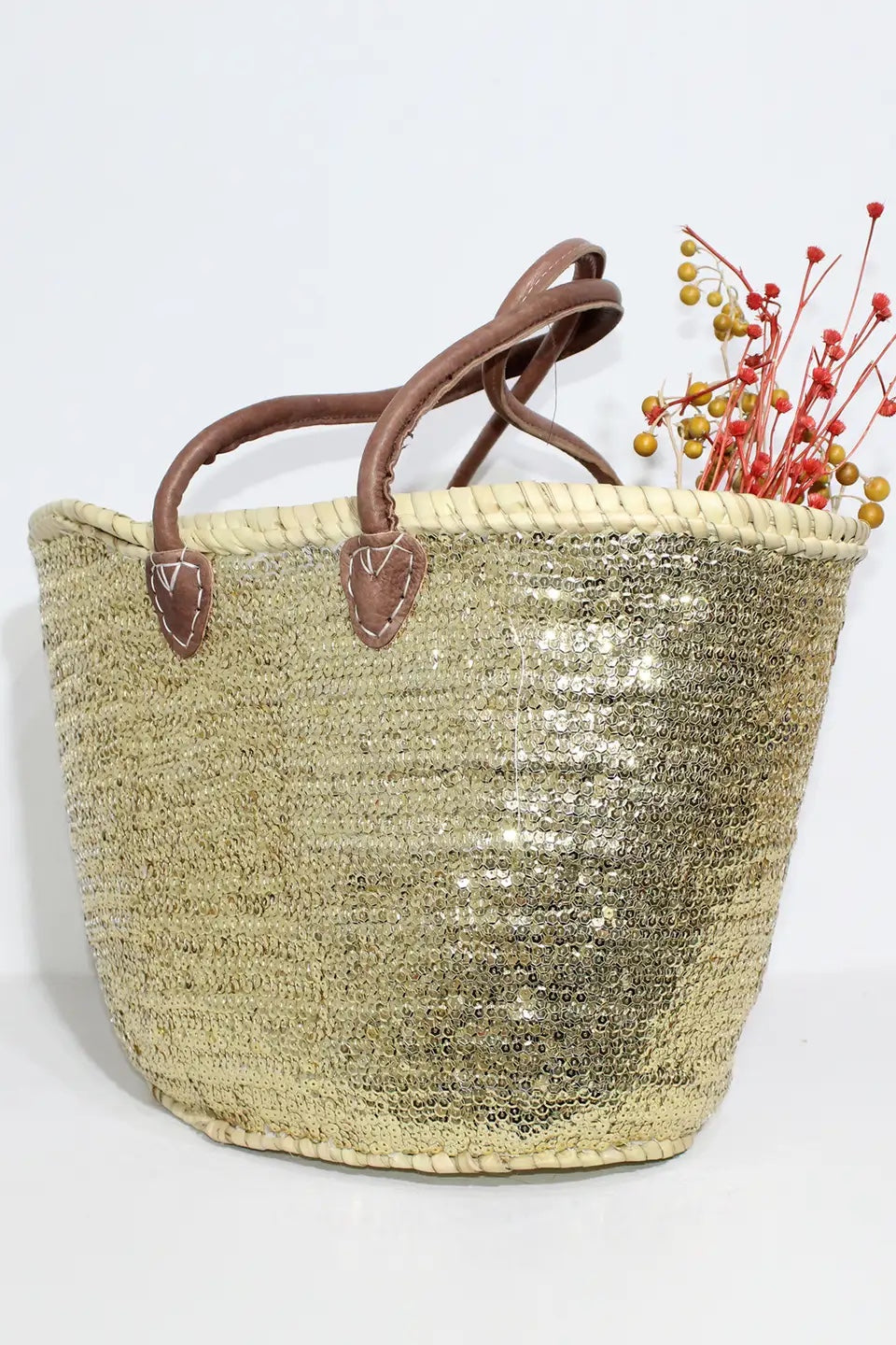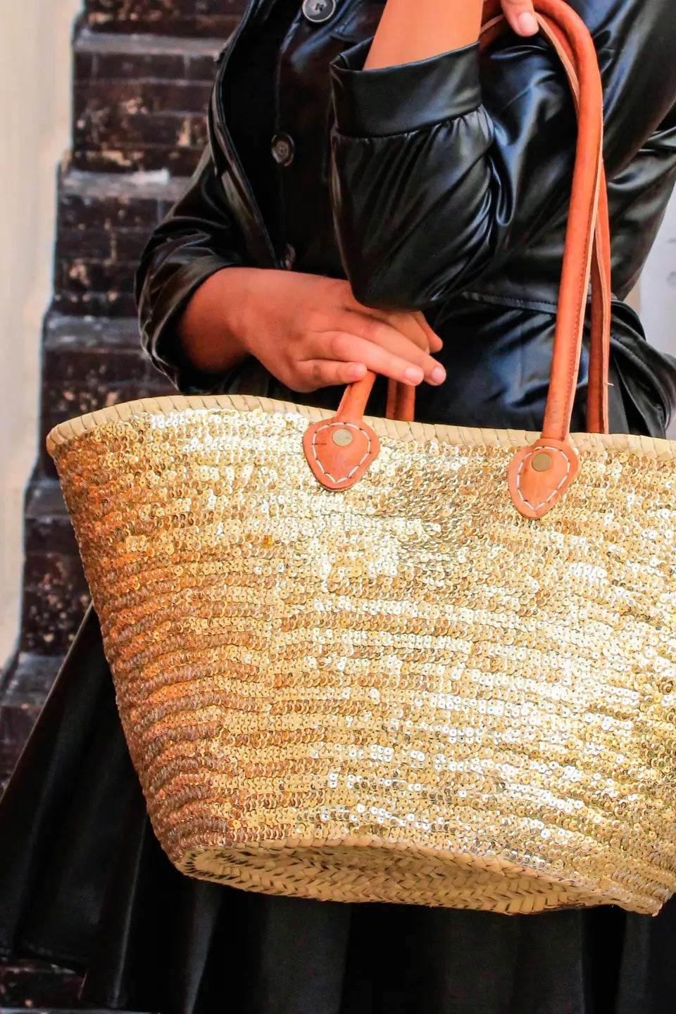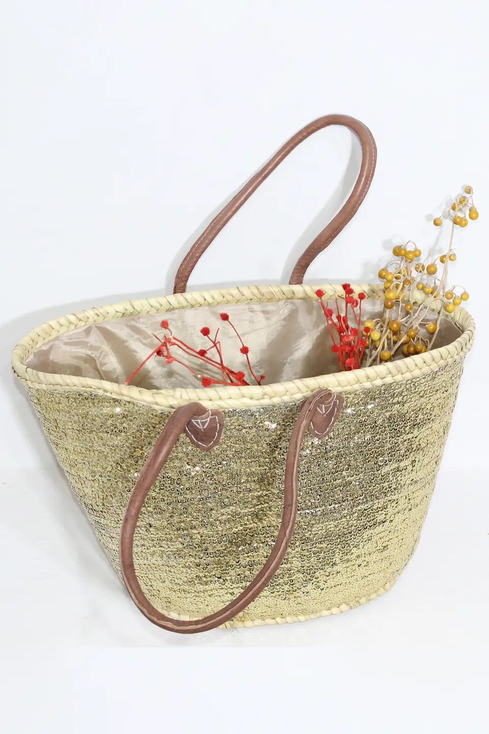 The Multicolor sequin bag is not only a practical but also a very stylish accessory for your trips to a sunny and hot beach, is a big sequin bag, woven of natural palm leaves, with an elegant rolled leather handles. This sequin shopper bag can stand out from the crowd with its unique features and provide you with comfort when you are carrying all your belongings during your trip to the beach or on a shopping tour.