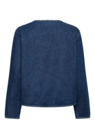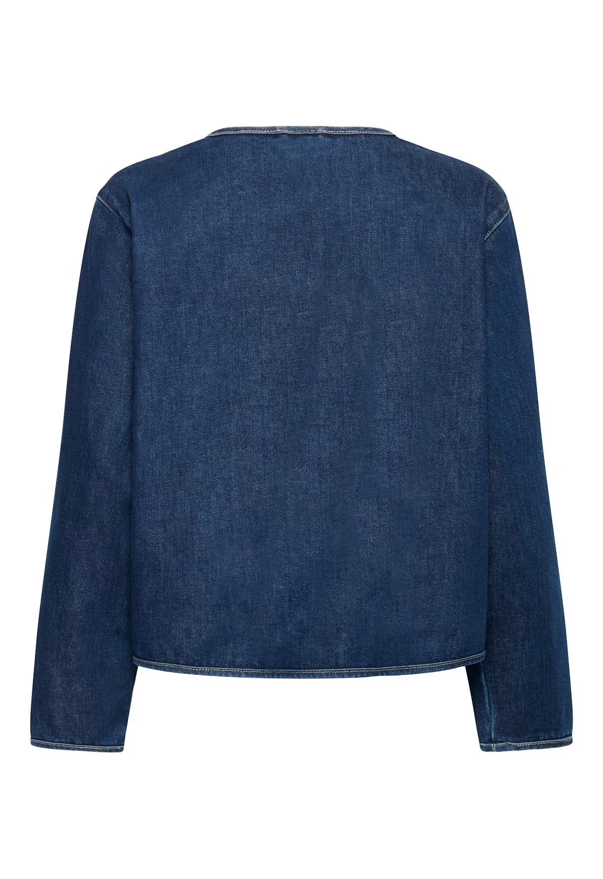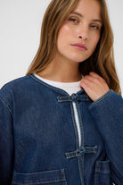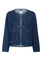 This denim jacket features a boxy silhouette with a straight fit, round neckline, and long sleeves. Two large front patch pockets stand out, while the front closes with two distinct knotted fastenings. The finish appears smooth and structured.