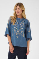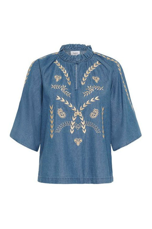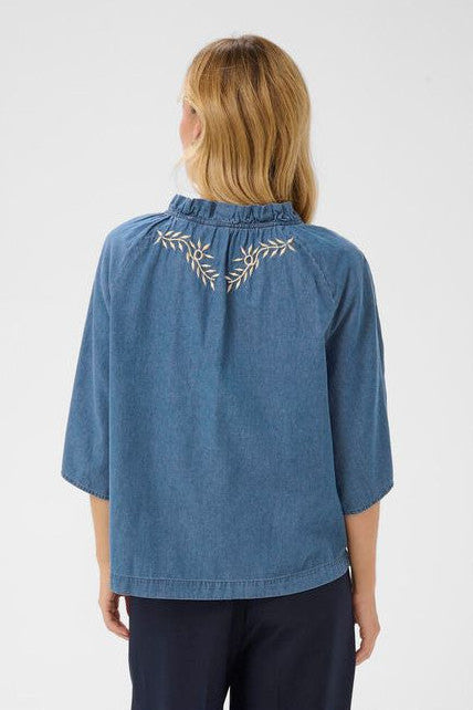 Cute denim top with a small stand-up collar with frill and a small button at the front. Nice embroidered pattern both front and back. 3/4 slightly wider sleeves.