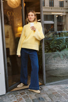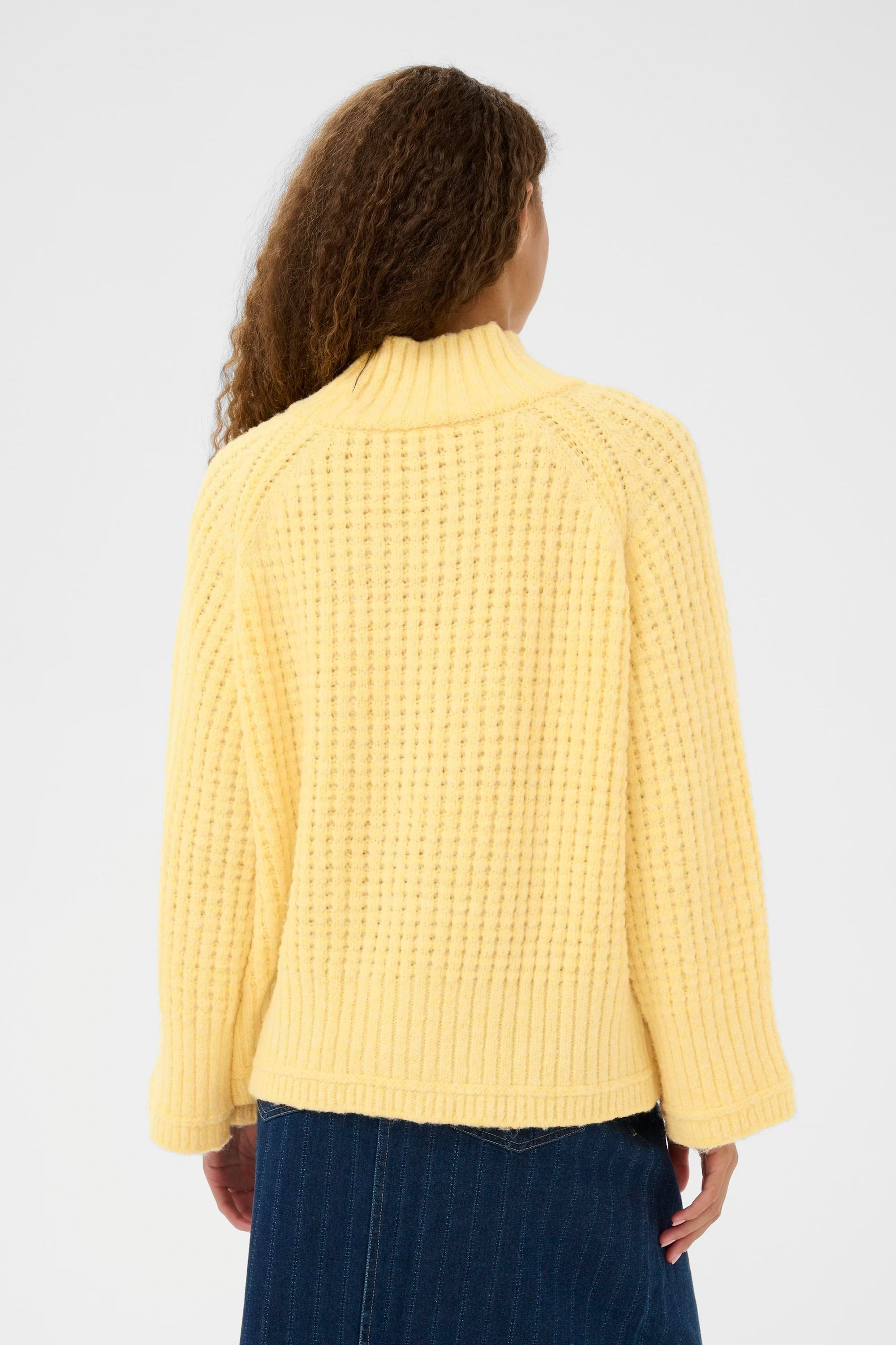 Chunky knit sweater features a straight, boxy silhouette and wide ribbed stand collar. Textured waffle knit adds visual interest, with long, slightly wide sleeves. Ribbing is present at the cuffs and hem for a structured finish.