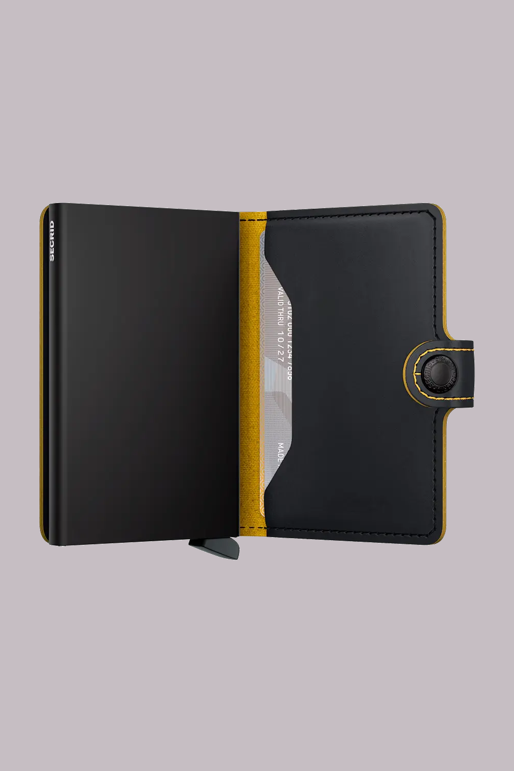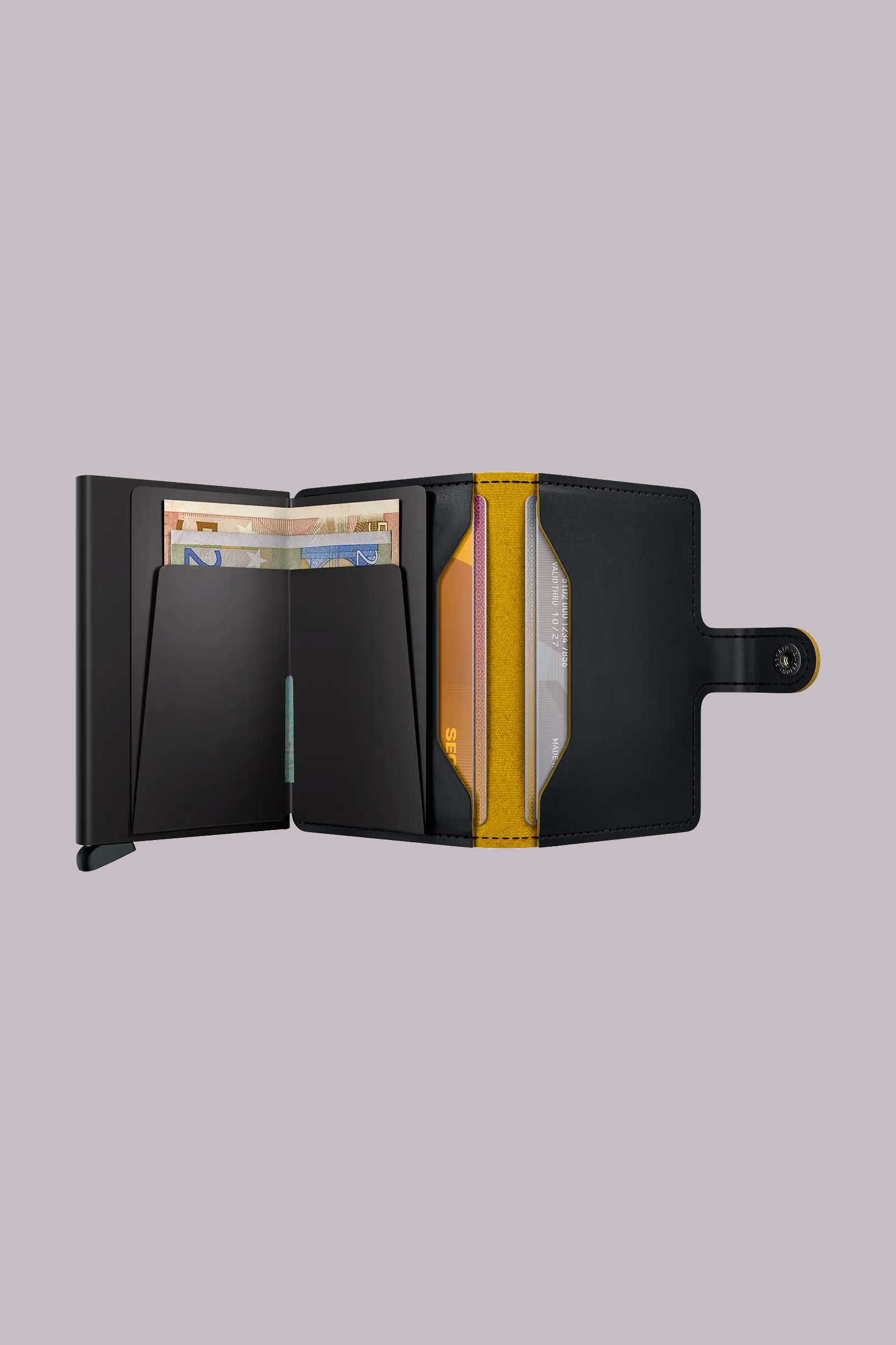 Small in size and surprisingly large in storage capacity, the Miniwallet combines the best of both worlds. The exterior holds banknotes, receipt and cards, while the aluminium Cardprotector allows you to slide out cards with one simple motion and protects them from bending, breaking and unwanted wireless communication.
