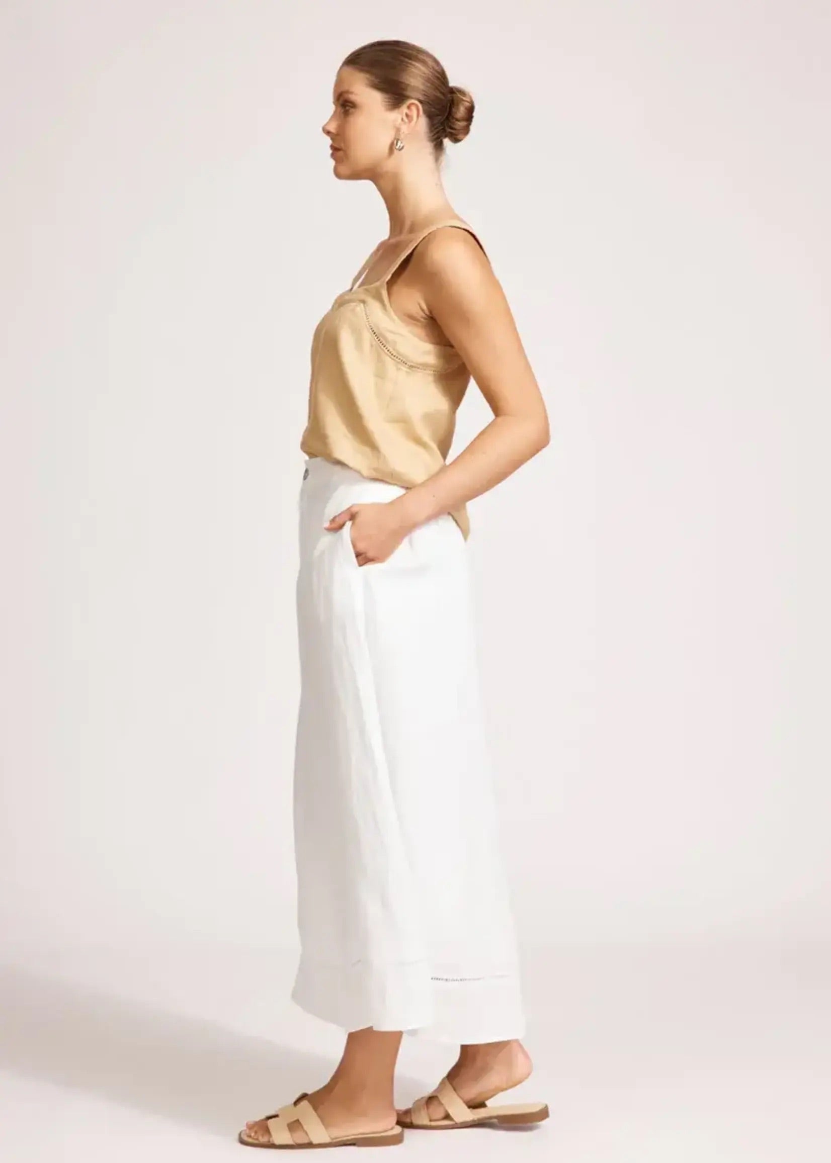 A timeless maxi skirt designed to flatter. Crafted from 100% linen with a flat front waistband and elasticated back for comfort. Features functional pockets, ladder lace trim above the hem, and an A-line silhouette.