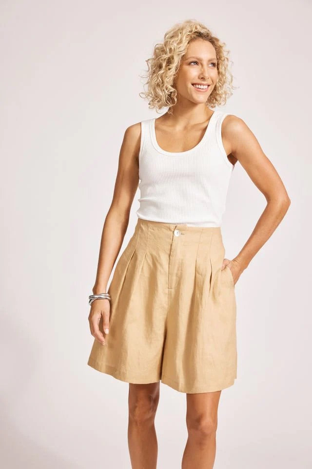 A high-waisted staple designed for warm-weather ease. Crafted from 100% linen with a flat front and elasticated back waist. Features subtle pleat detailing and a mid-length wide leg for relaxed movement. Fully lined for comfort.