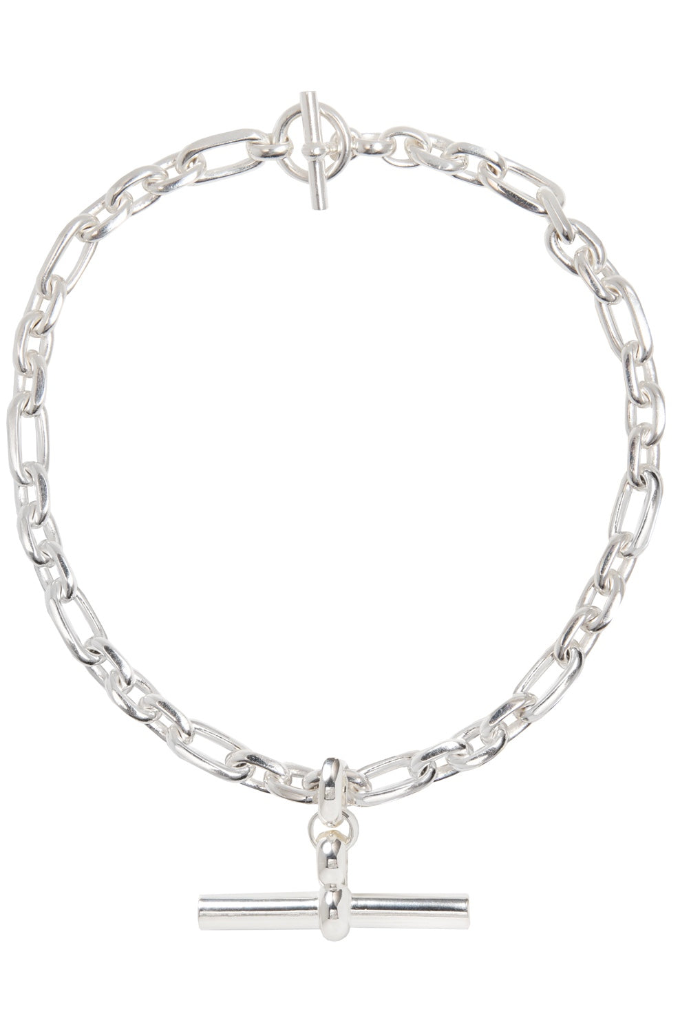 This Tilly Sveaas necklace sums up what Tilly does so well. Taking an old classic and giving it a bold fresh makeover. The Silver watch chain and giant T-bar are both hand carved out of bronze and plated in sterling silver.