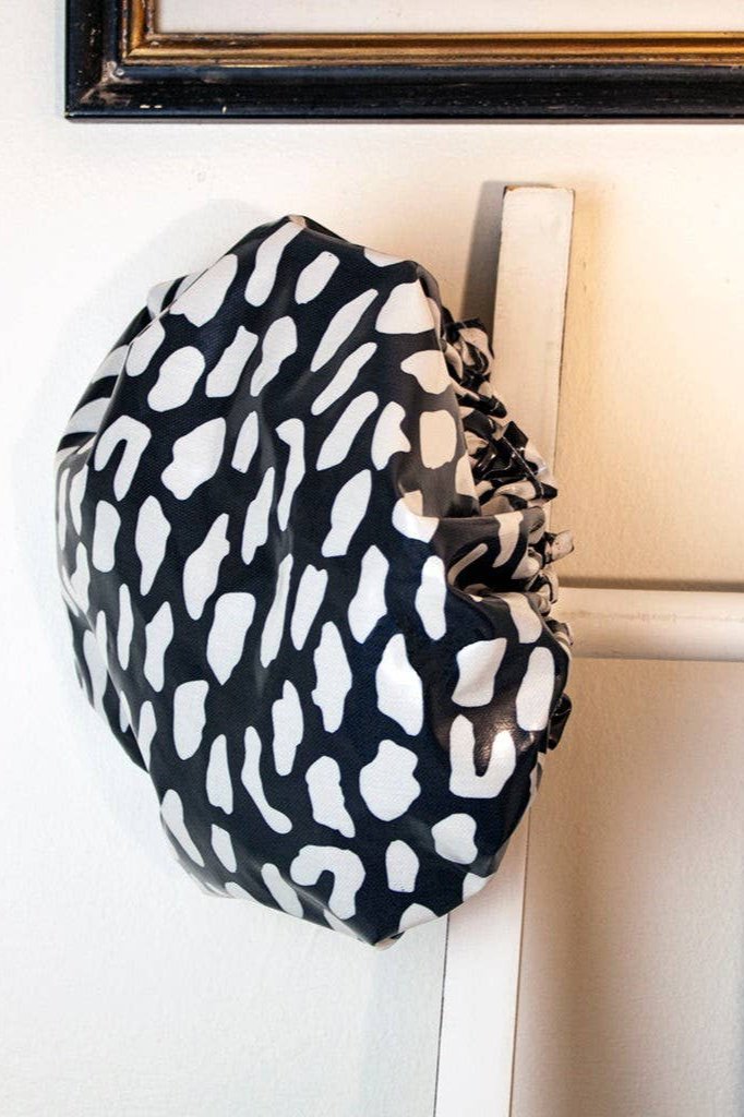 A smart and lightweight shower hat, in our contemporary black/off-white, hand-drawn rock pool print, designed by us in surrey and inspired by walks on the beach amongst the pebbles. This hat has a contrast edge printed in our coral reef design.