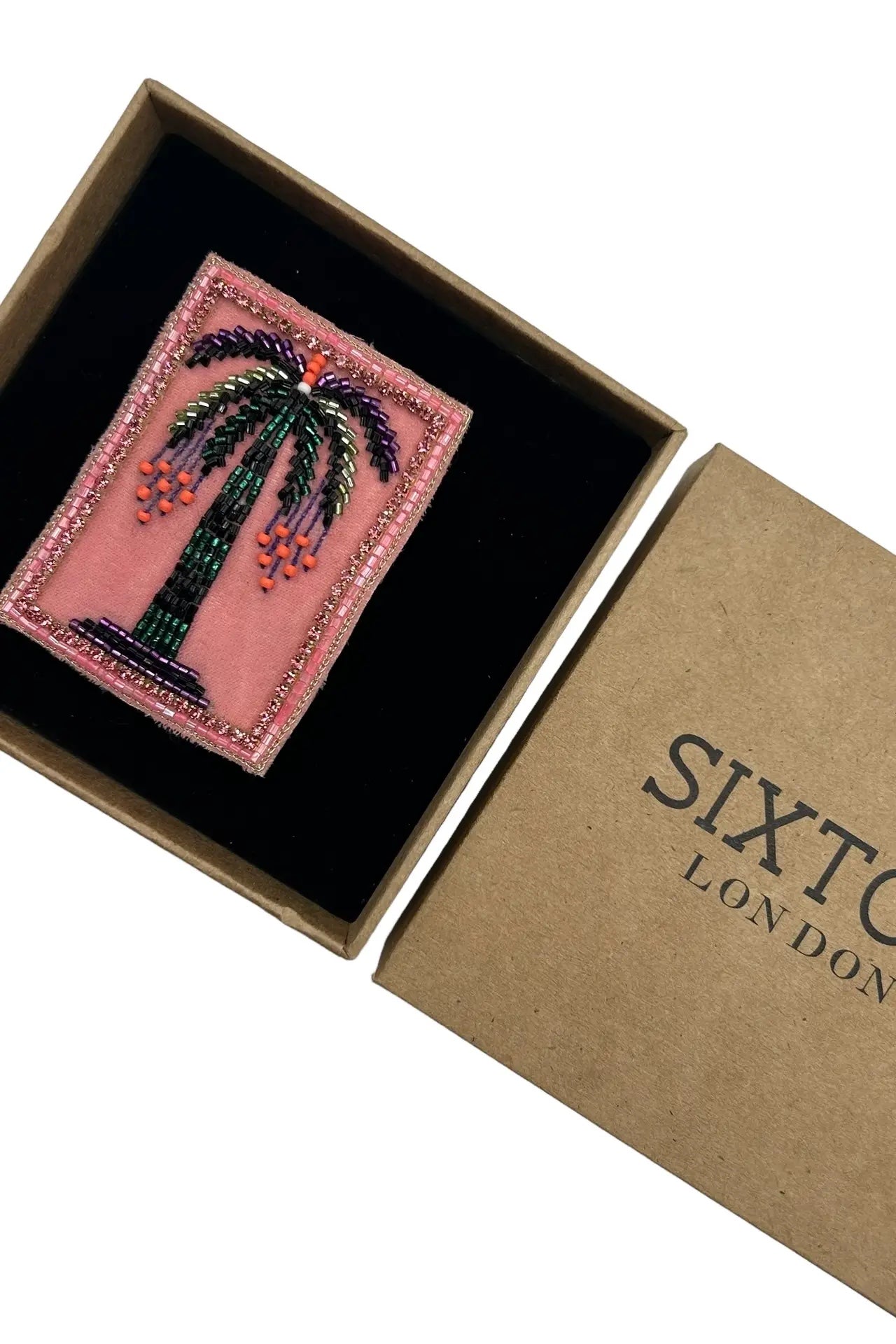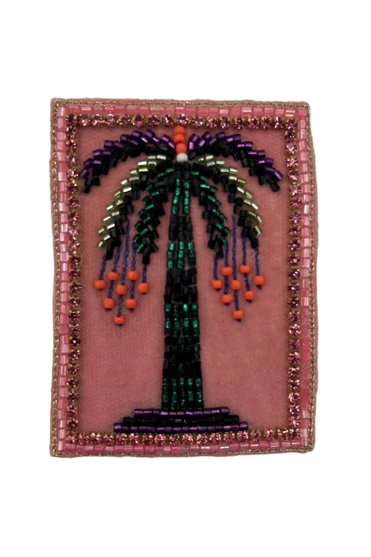 A stunning pink palm tree portrait style brooch. Hand beaded on pink velvet. This pin measures 5cm across and 6.5cm from top to bottom.