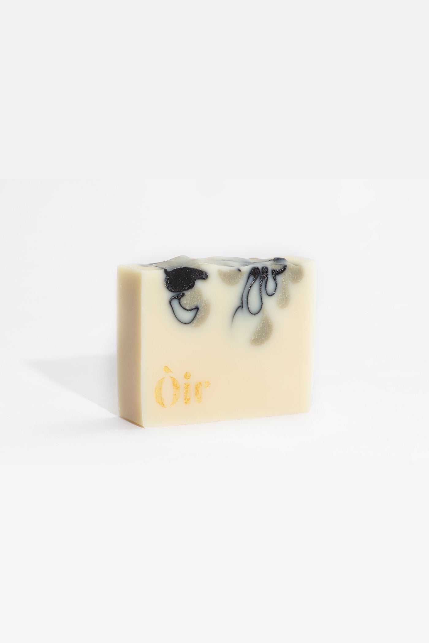 Ingredients: sodium olivate (olive oil), sodium cocoate (coconut oil), sodium shea butterate (shea butter), sodium castorate (castor oil), sodium cocoa butterate (cocoa butter), aqua (water), glycerine, cedrus atlantica wood oil (cedarwood essential oil), salvia sclarea flower oil (clary sage essential oil), pelargonium roseum leaf oil (rose geranium essential oil), Vetiveria Zizanoides Root Oil (vetiver essential oil), charcoal powder, kaolin, gold mica