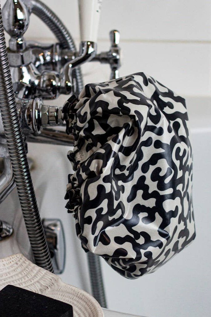 A smart and lightweight shower hat, in our unique black/off-white, hand-drawn coral reef print, designed by us in surrey and inspired by some pre-lockdown snorkelling. This hat has a contrast edge printed in our rock pool design.