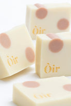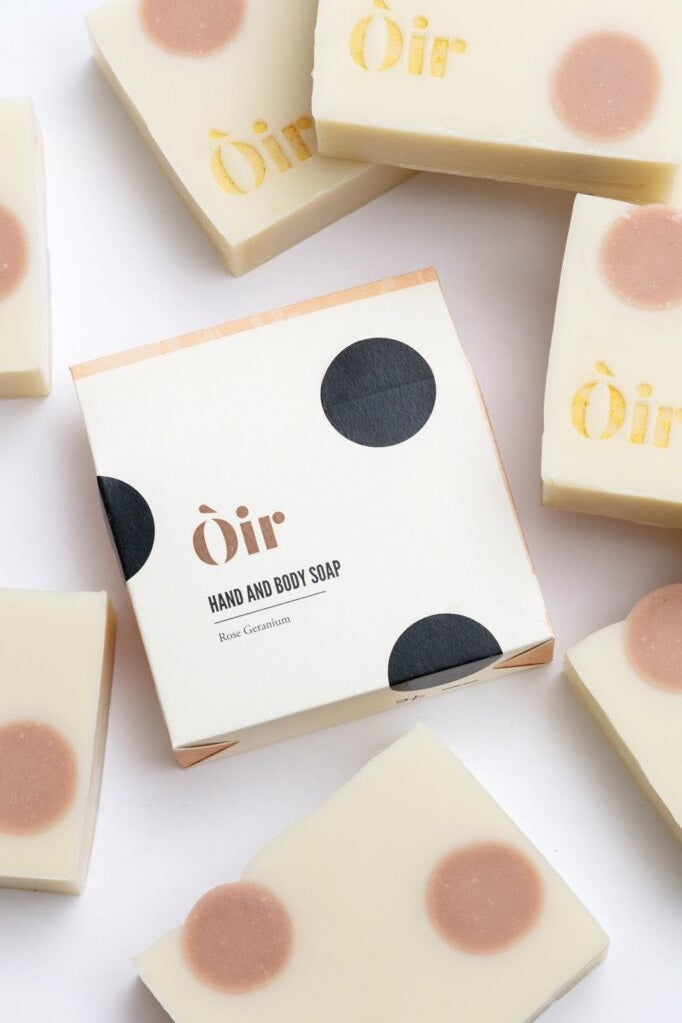 Ingredients: sodium olivate (olive oil), sodium cocoate (coconut oil), sodium shea butterate (shea butter), sodium castorate (castor oil), sodium cocoa butterate (cocoa butter), aqua (water), glycerine, pelargonium roseum leaf oil (rose geranium essential oil), kaolin, gold mica