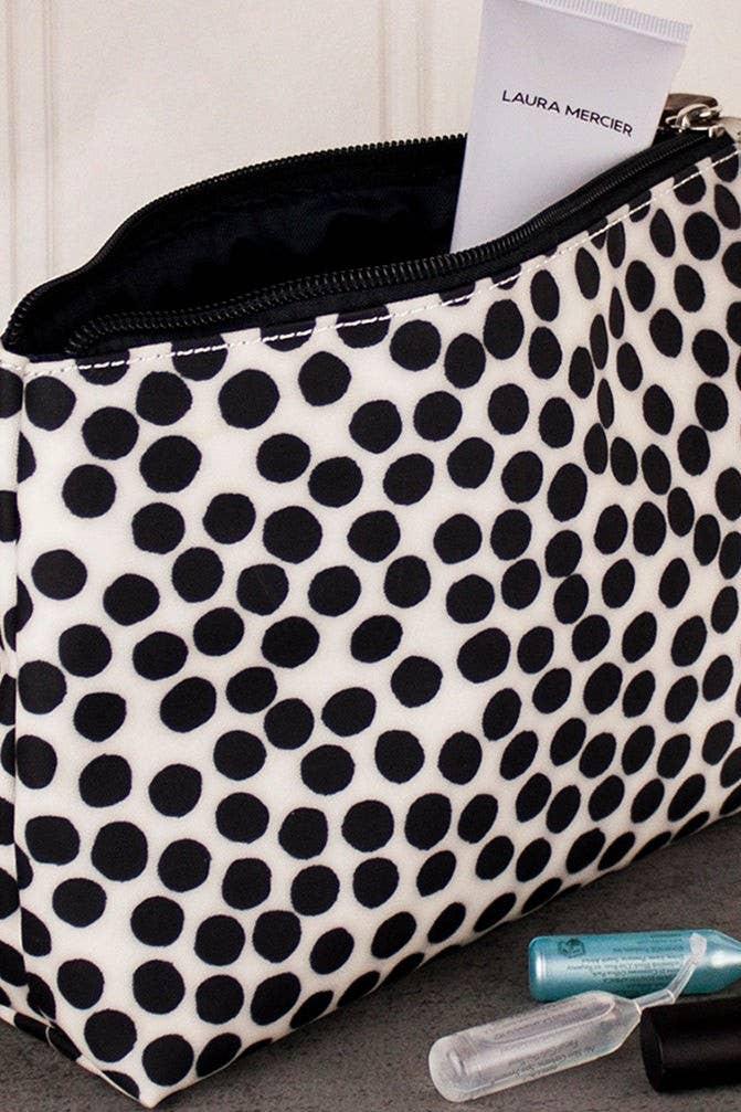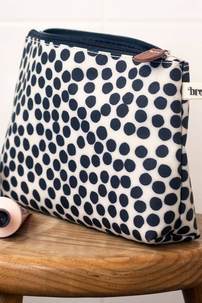 A wider version of our pouch-shaped compact make up bag which will hold more items including pencils and brushes, in our unique black/off-white, hand-drawn spot print, designed by us in our surrey studio.
