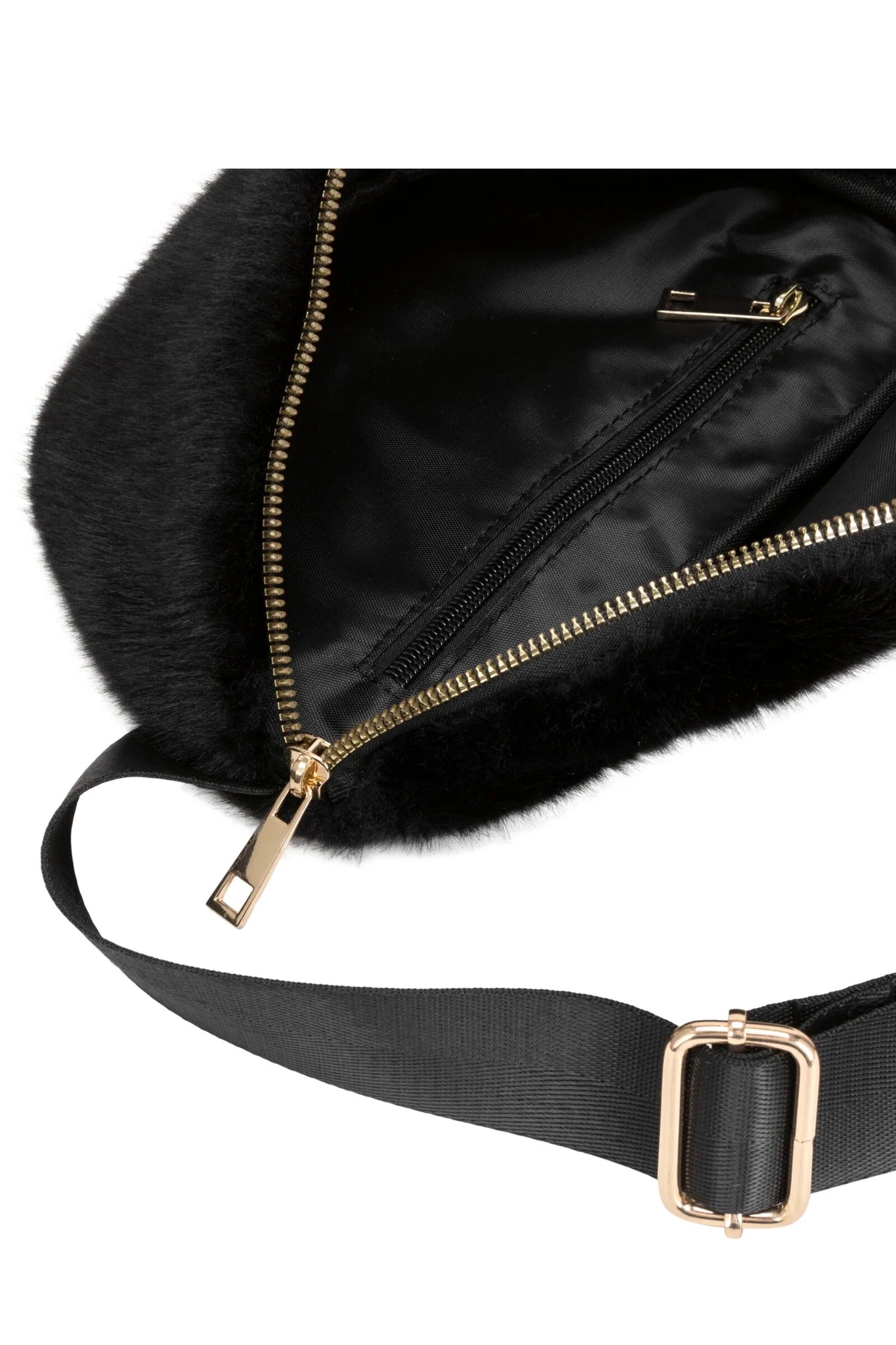 Elevate your style with this black faux fur sling bag, combining elegance and cozy texture. Its sleek design offers effortless versatility, making it the perfect accessory to complement both casual and refined outfits. The soft faux fur exterior adds a touch of sophistication, while the compact size ensures convenience and comfort for everyday wear.