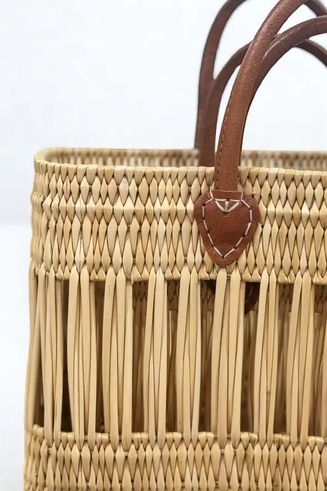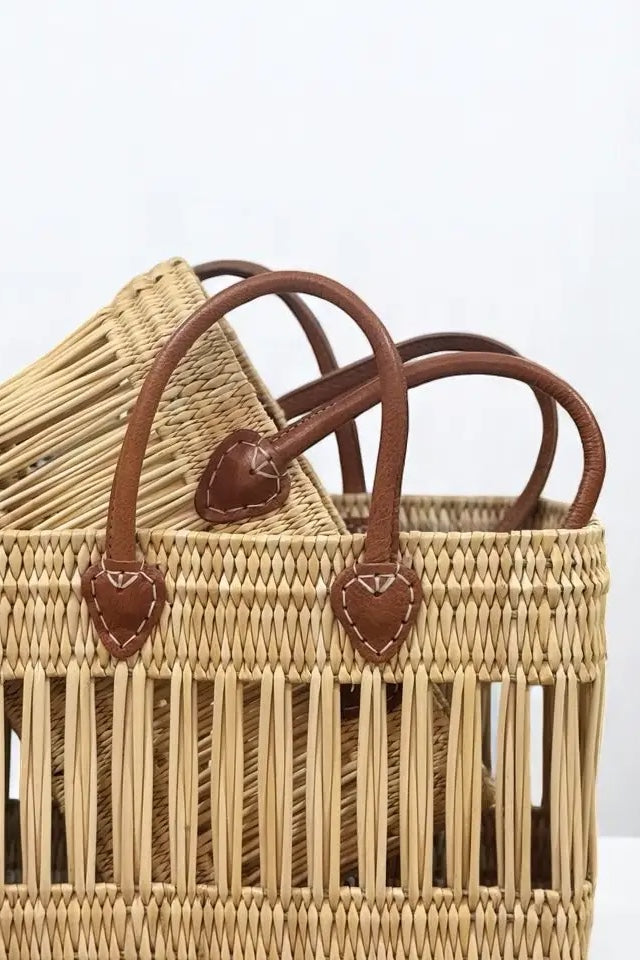 Elevate your shop’s offering with this beautifully handcrafted Moroccan straw tote, available with your choice of genuine leather handles or durable braided rope handles. Meticulously woven from natural palm leaves, this rectangular basket combines rustic charm with modern utility—perfect for farmers markets, beach days, or daily errands. Each bag is handwoven by skilled artisans, making every piece unique and eco-conscious.