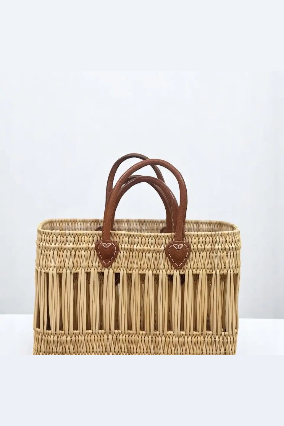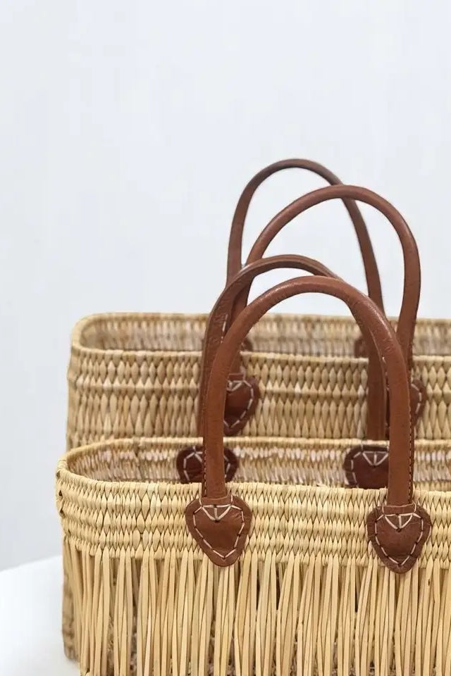 Elevate your shop’s offering with this beautifully handcrafted Moroccan straw tote, available with your choice of genuine leather handles or durable braided rope handles. Meticulously woven from natural palm leaves, this rectangular basket combines rustic charm with modern utility—perfect for farmers markets, beach days, or daily errands. Each bag is handwoven by skilled artisans, making every piece unique and eco-conscious.