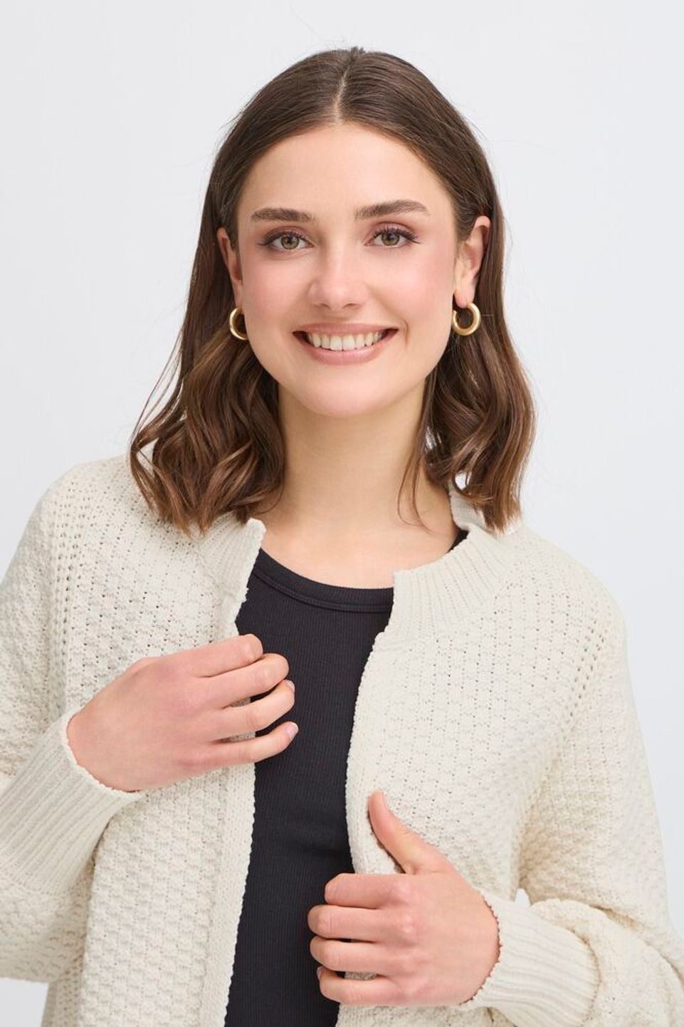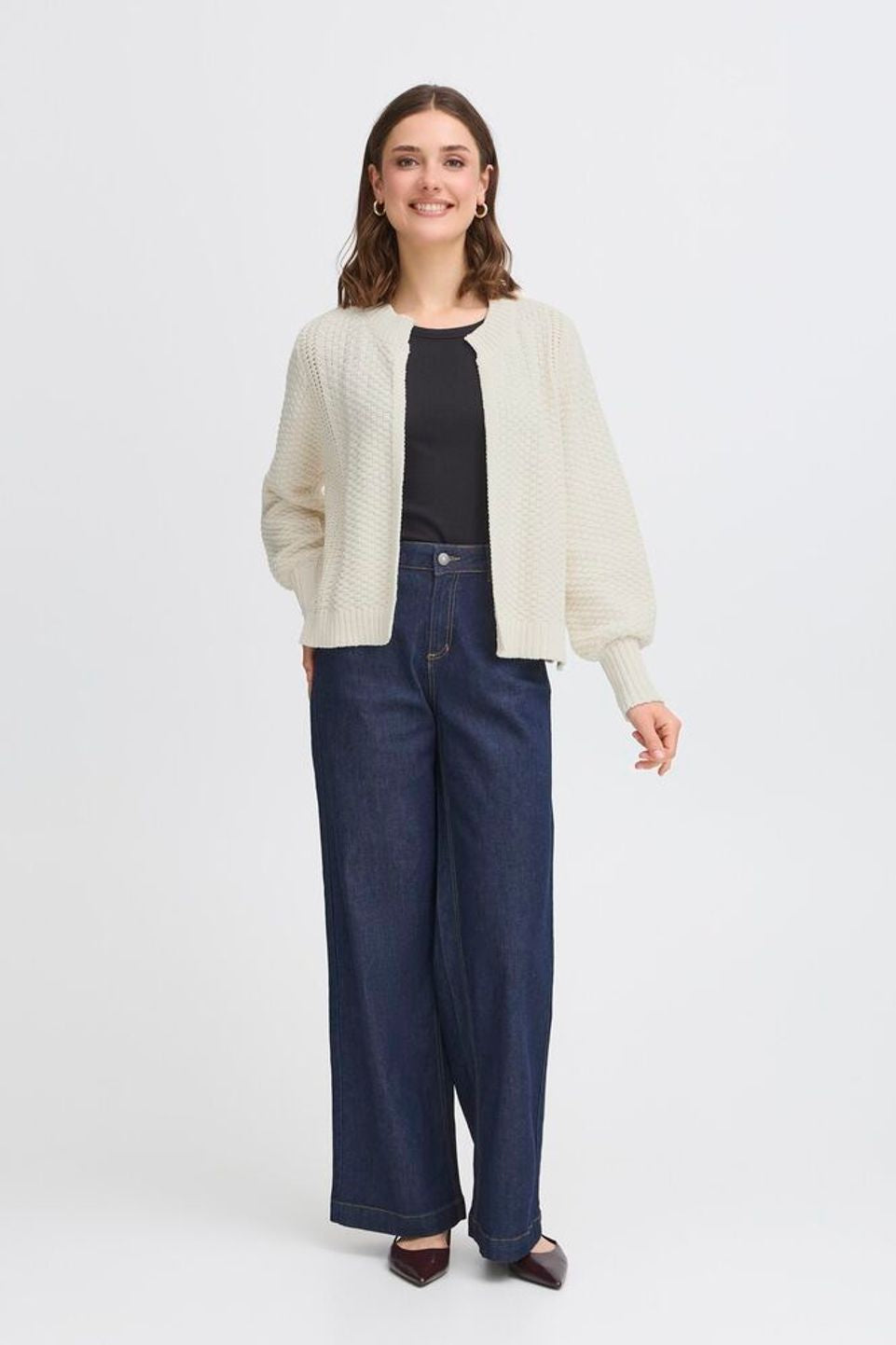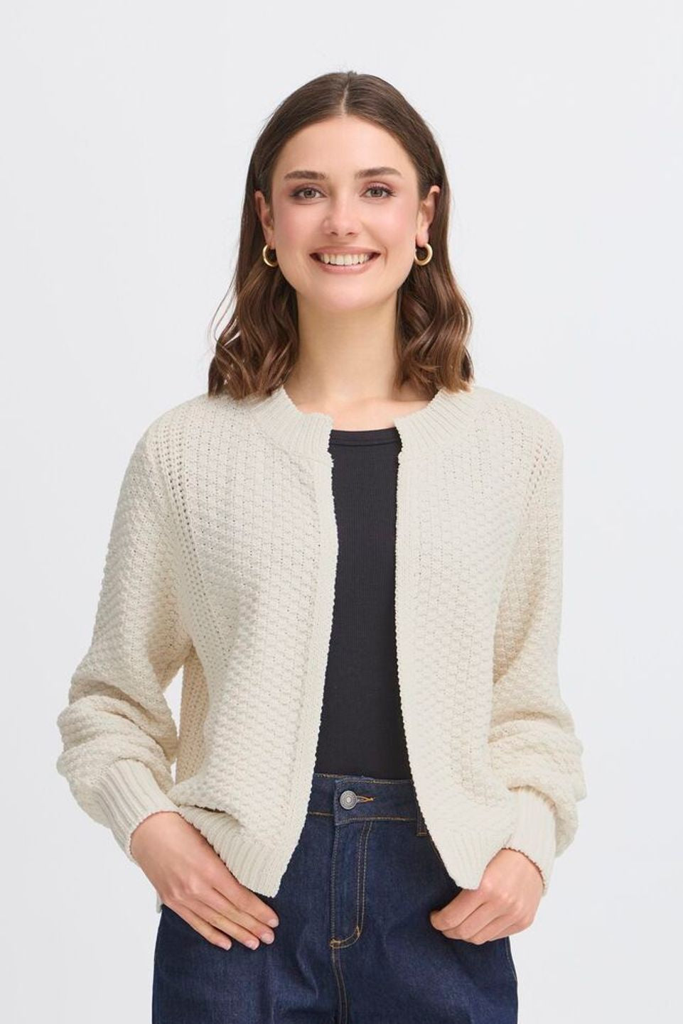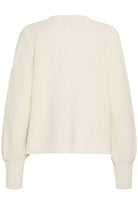 Kamille Cardigan in Whisper White. Crafted with a delicate ribbed texture, this cardigan offers a refined silhouette that effortlessly complements any ensemble. Its soft, breathable fabric ensures comfort while adding a touch of understated elegance to your look. Perfect for layering, the Kamille Cardigan brings a sophisticated finish to both casual and formal outfits.