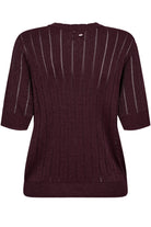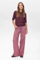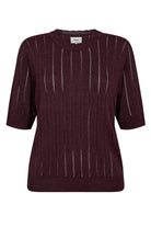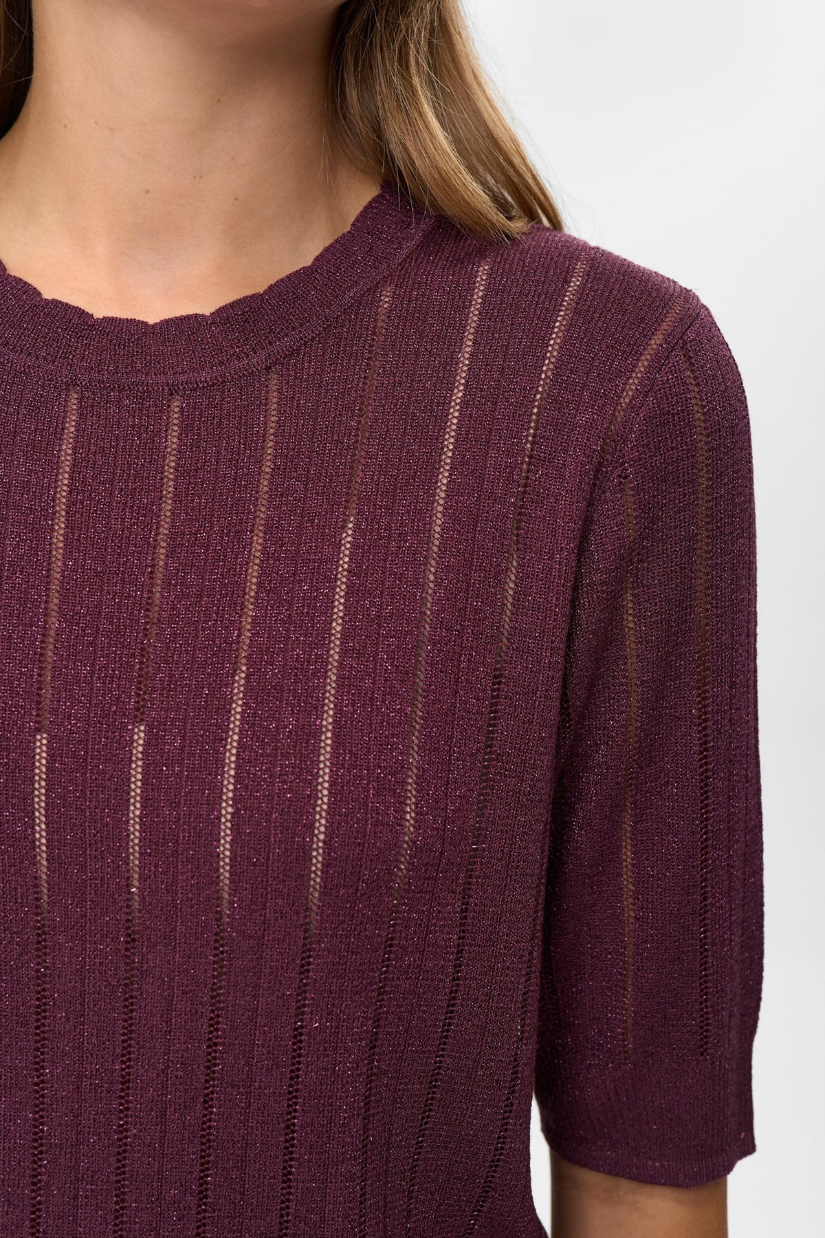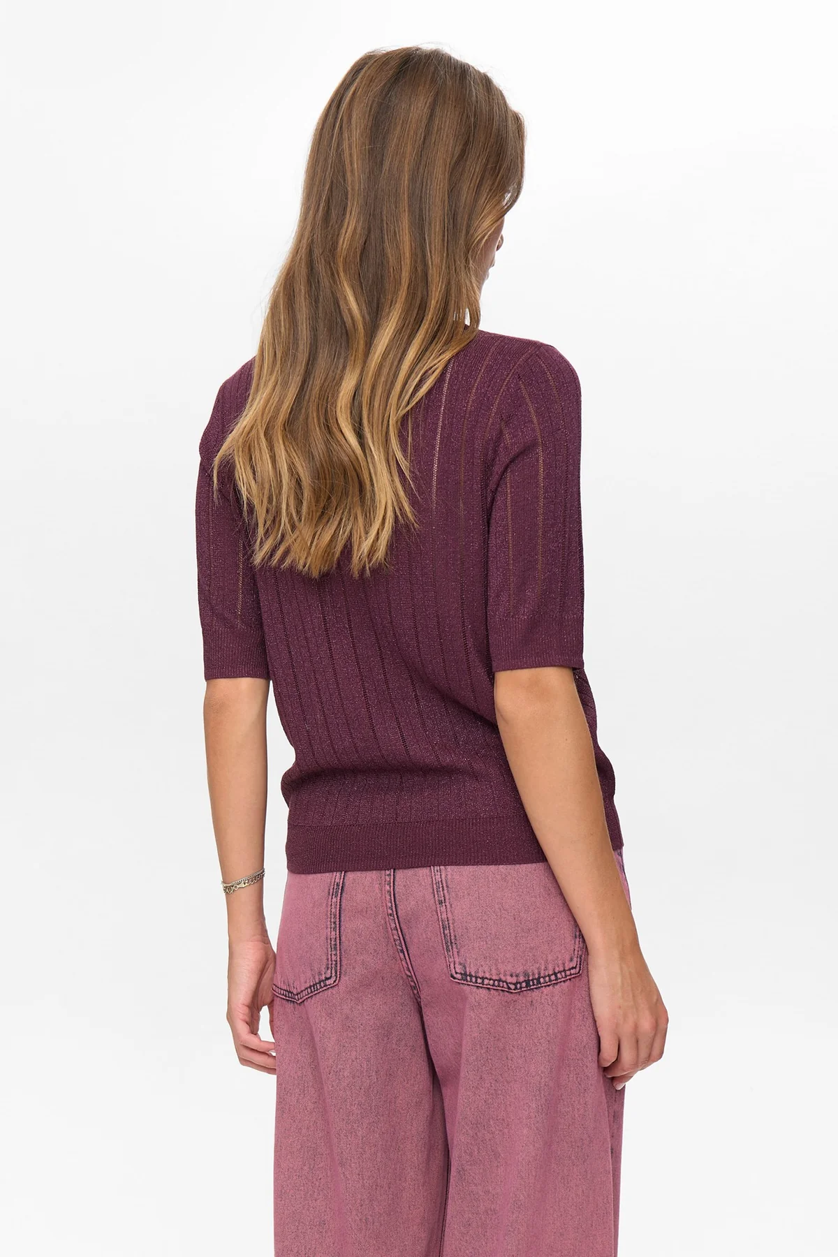 Add a touch of sparkle to your everyday style with the Nümph Numisja short sleeve pullover in Winetasting. Designed in a rich wine tone with metallic thread running through, this knit brings subtle shimmer to your look. Finished with ribbed trims and a crew neckline, it’s perfect with wide-leg trousers or layered under blazers for a pop of colour and texture. Made with 76% LENZING™ ECOVERO™ Viscose for a soft, sustainable feel.
