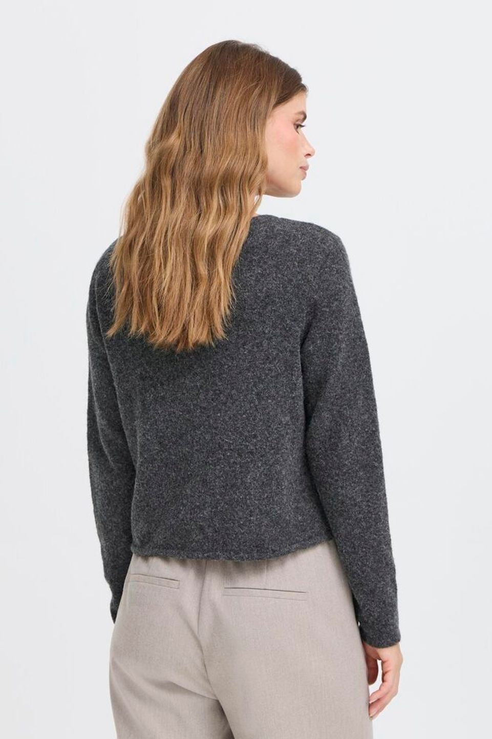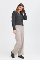 Noah Cardigan in Charcoal Grey. Crafted from a refined blend of nylon, acrylic, wool, and elastane, this knitted piece ensures both comfort and subtle stretch. Its regular fit and cropped length provide a modern silhouette, while long sleeves add understated elegance. Perfect for layering, this cardigan seamlessly combines warmth with sophisticated style.