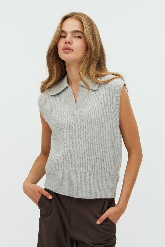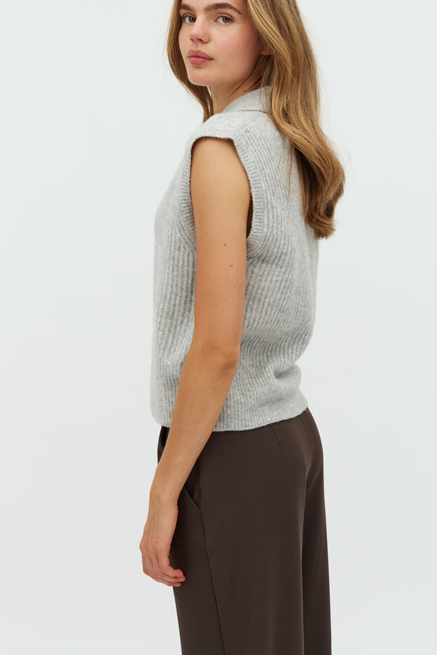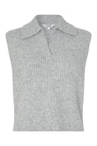 Elevate your wardrobe with the Ritika Knitted Vest in Light Grey Melange. Crafted from a premium blend of acrylic, nylon, wool, and elastane, this vest offers both comfort and a refined fit. Featuring a subtle v-neck and a tailored collar, it effortlessly combines classic sophistication with modern style, making it a versatile piece for layering in any season.