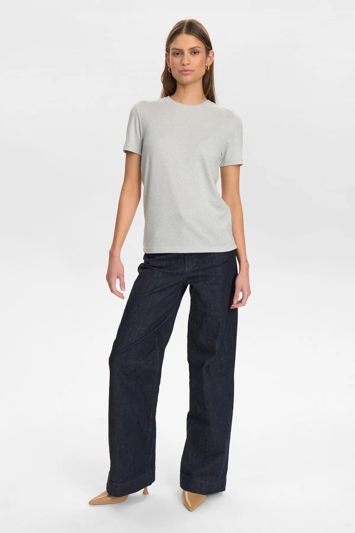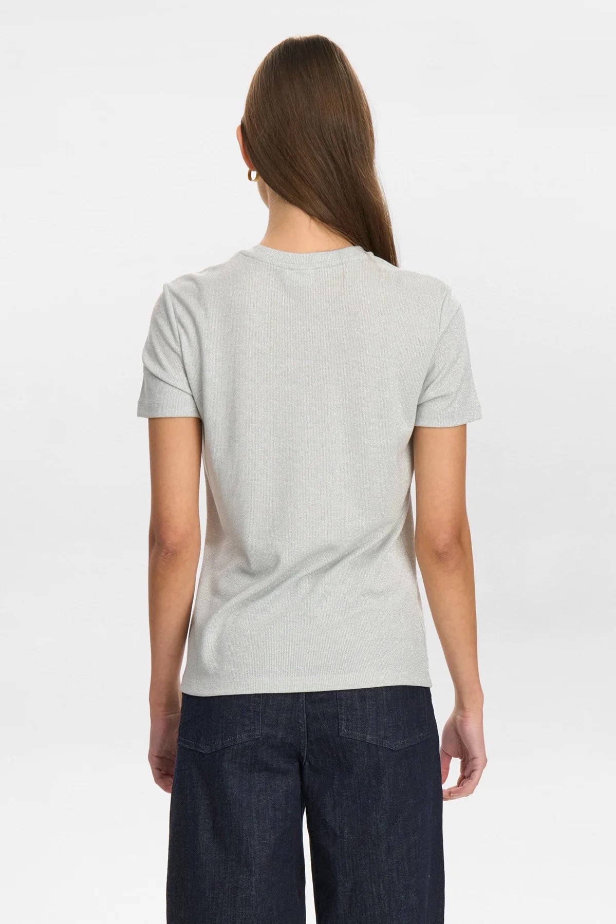 This Glam T-shirt in silver combines elegance with versatility. Crafted from a blend of viscose, metallic yarn, and a touch of elasthane, it offers a subtle shimmer and comfortable stretch. Wear it alone for a refined statement or layer under a jacket to elevate your summer ensemble with effortless sophistication.