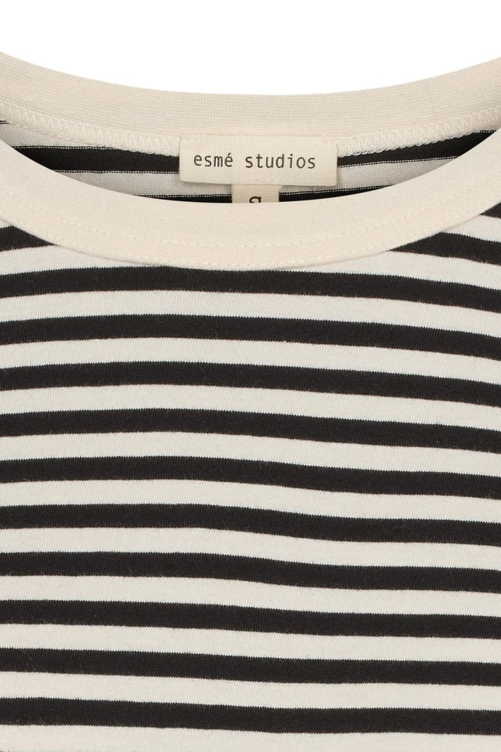 Introducing the Signe Boxy T-Shirt in Black Stripe. Made with 100% GOTS certified organic cotton, this t-shirt offers not only a boxy fit and 2/4 sleeves, but also a classic O-neck for a modern, relaxed look. The logo label at the hem adds a subtle touch of branding to this essential piece. Measuring at 60 cm in size S, this t-shirt will elevate your style with its quality and sophistication.
