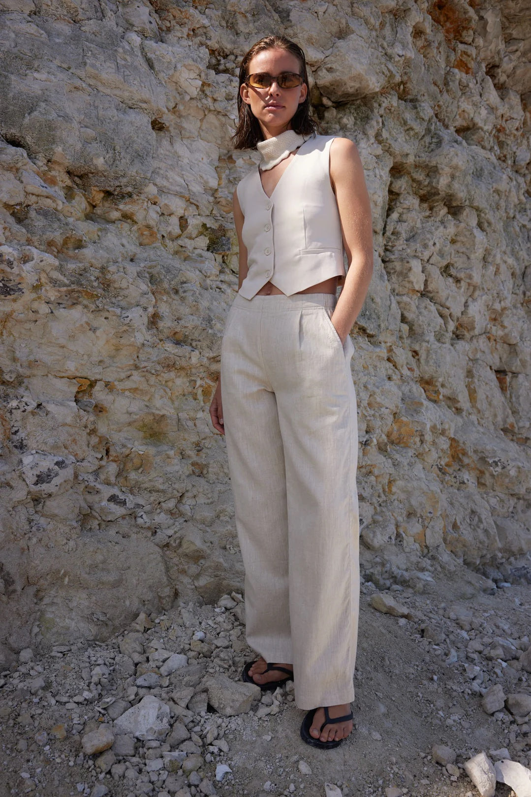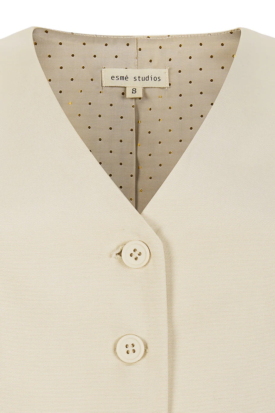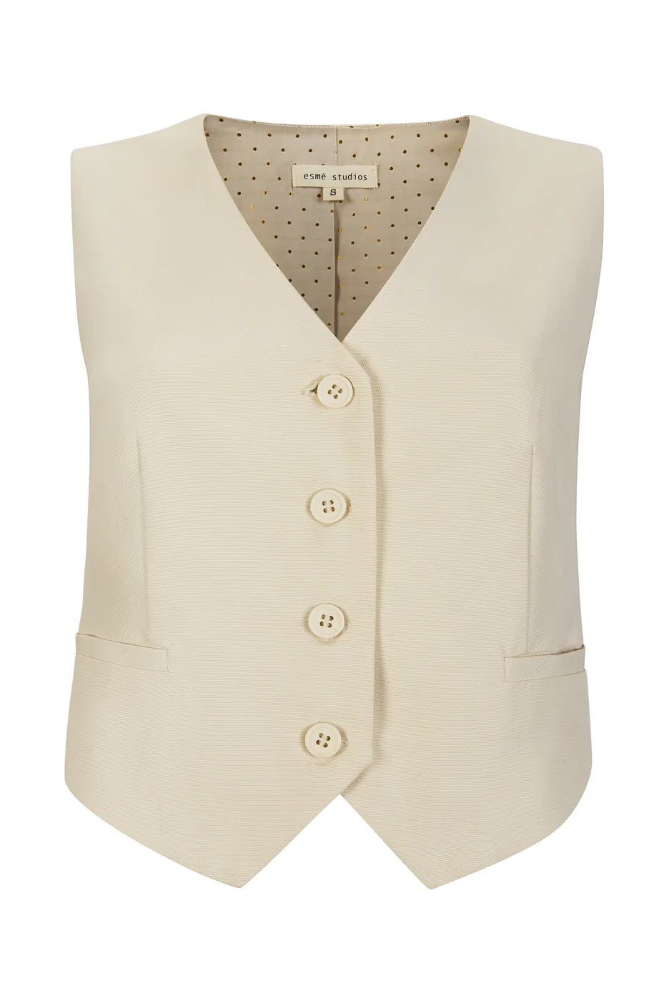 Introducing the Tammi vest, made from 54% organic cotton and 46% lyocell. Its slim-fit design, tie detail, and button closure create a tailored look, while the dotted lining adds a touch of sophistication. With a back length of 43cm in size S, this vest is both stylish and sustainable.